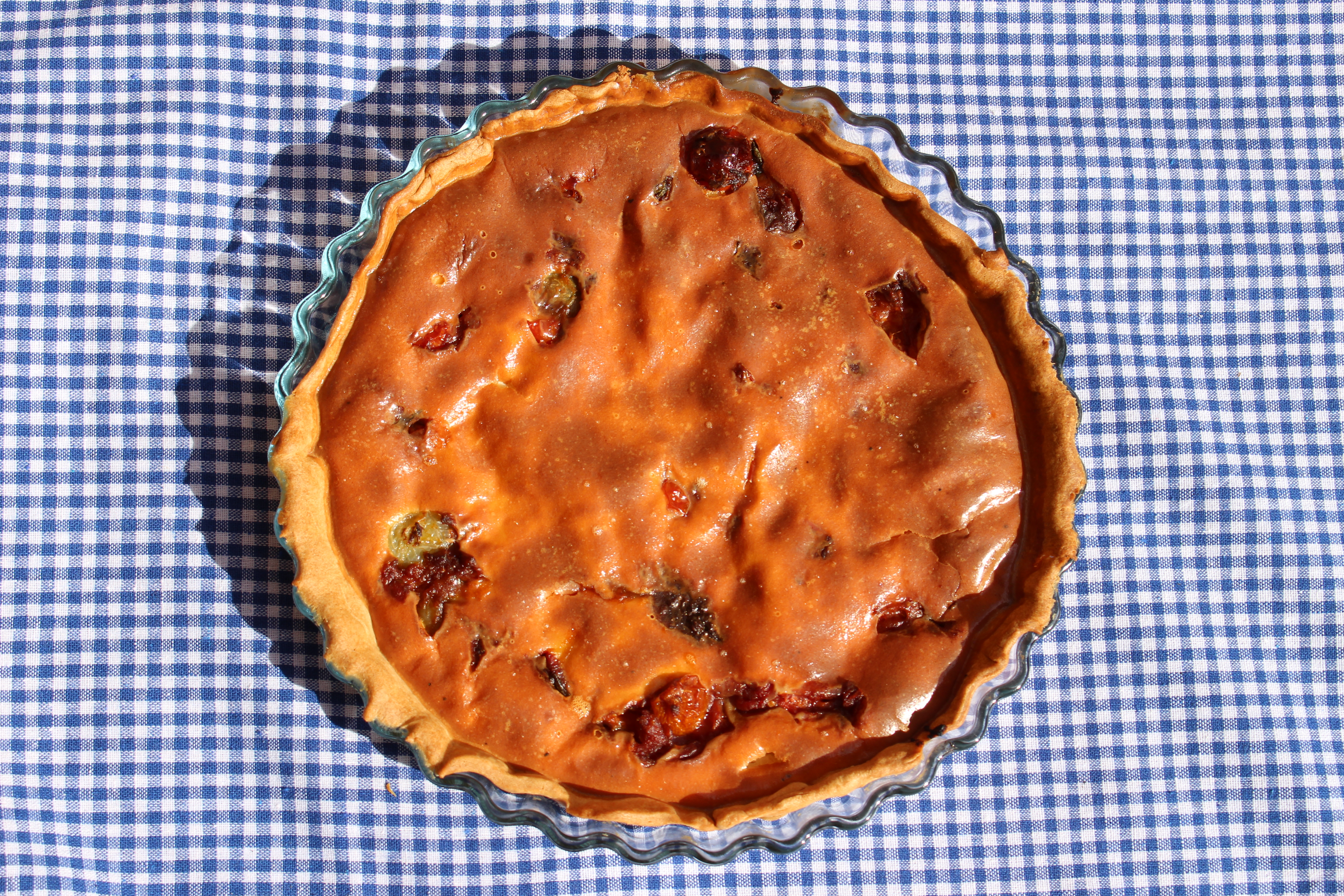 Ponemos encima de la masa de hojaldre la mezcla de tomates cherry y demás, y cubrimos con la mezcla de huevos y nata.