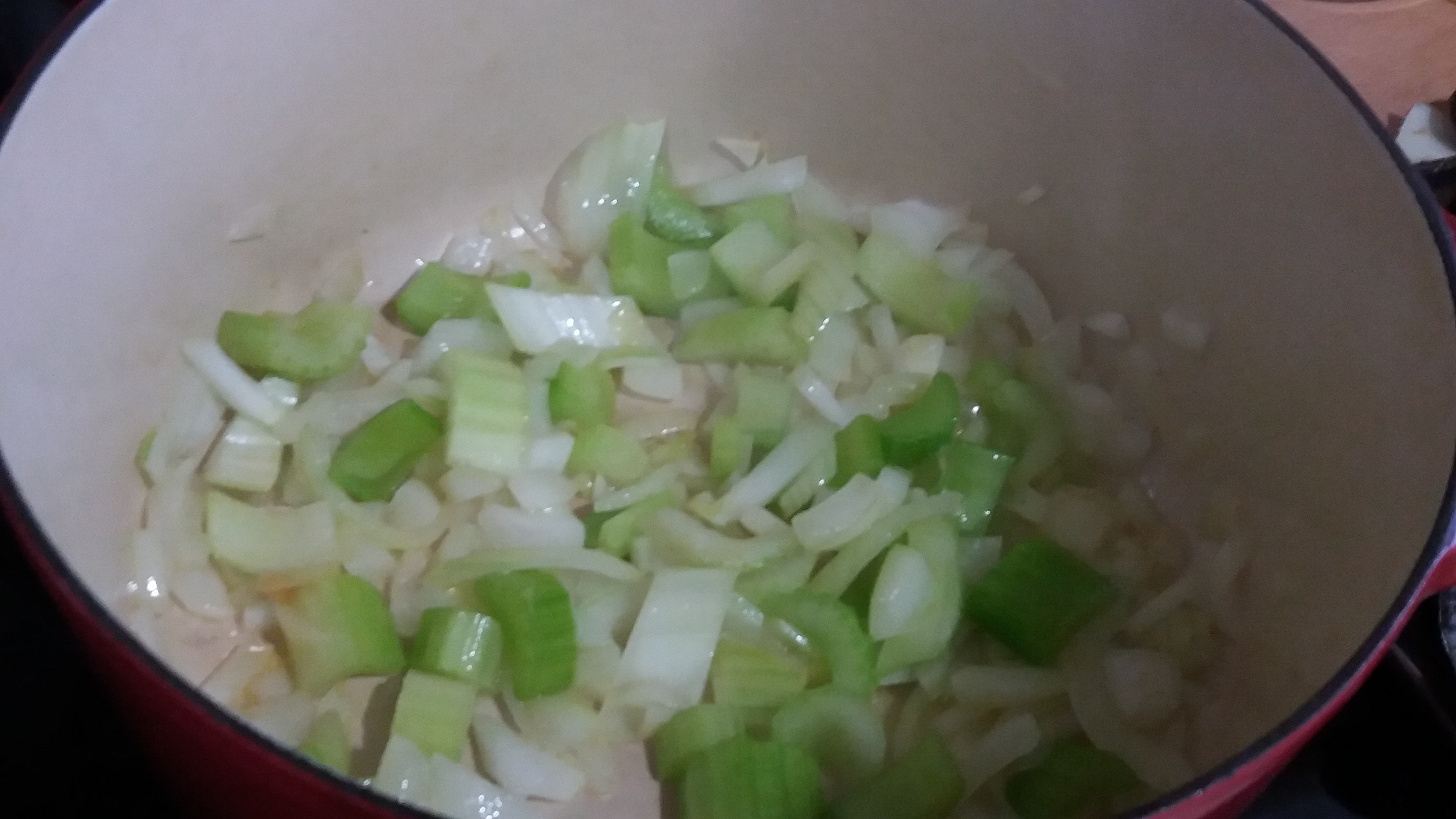 En una olla/cazuela con un chorrito de aceite de oliva, pochamos la cebolla y el puerro bien picaditos, y el apio en trocitos, durante unos 10 minutos a fuego medio: