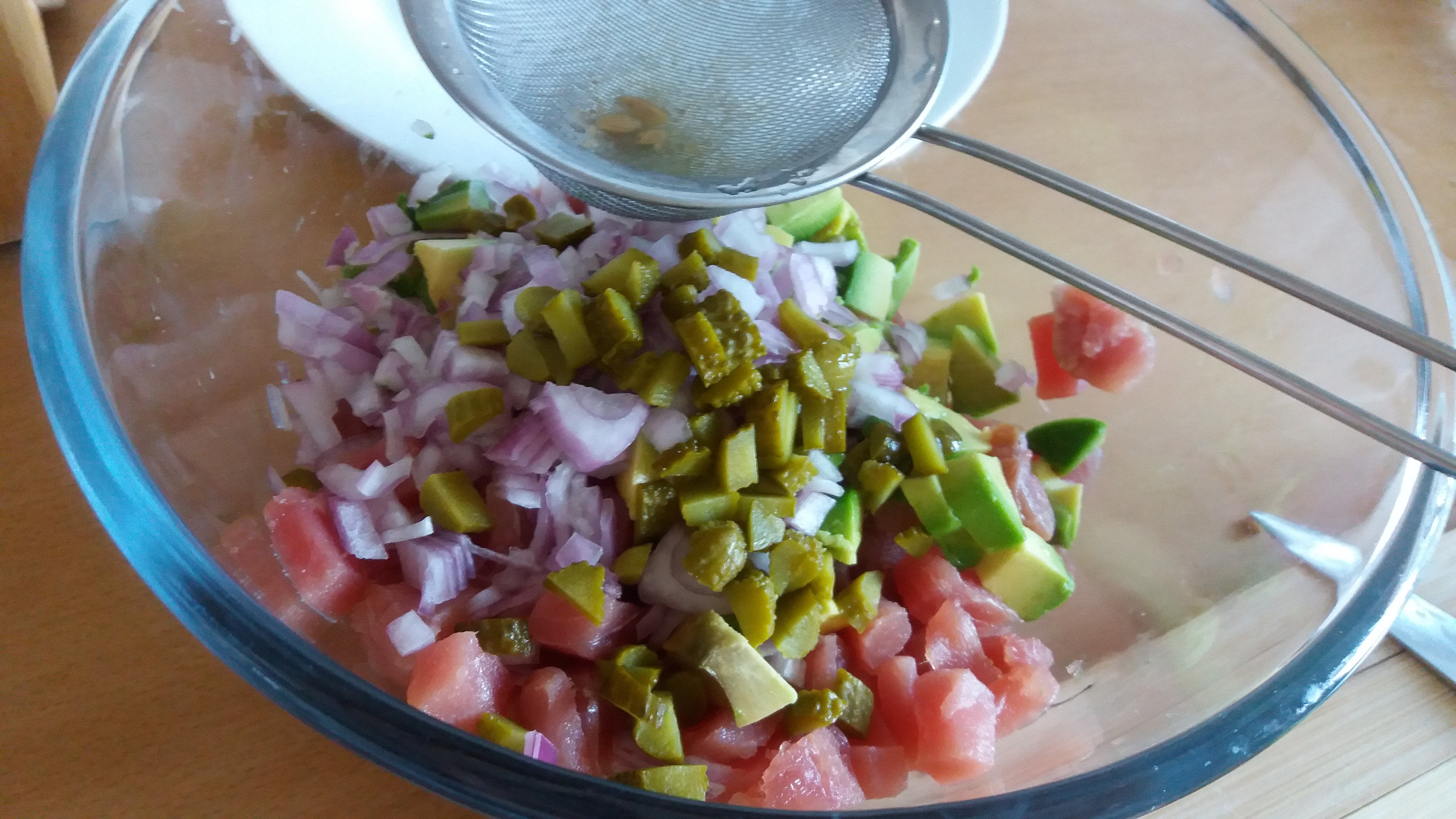 Añadimos al bol el zumo de limón, el cebollino previamente picado con unas tijeras, los pepinillos picados súuuper pequeños y la mostaza: