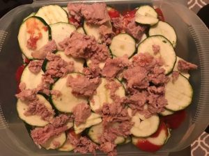 Escurrimos las latas de atún, sin conservar el aceite, y ponemos el atún más o menos desmigado por encima de los calabacines laminados. Cubrimos el conjunto con la mitad del tomate frito.