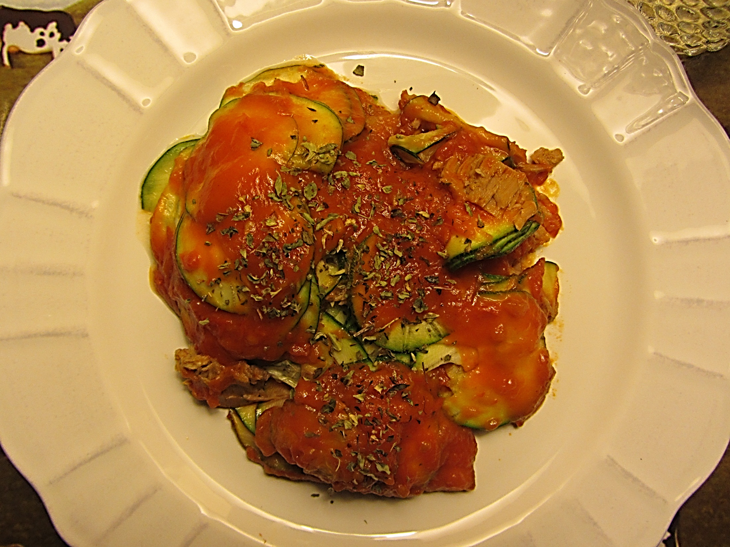 Lo sacamos, servimos en platos (mejor no esperar mucho porque los calabacines son muy acuosos) y espolvoreamos cada ración con oregano y/o queso rallado.