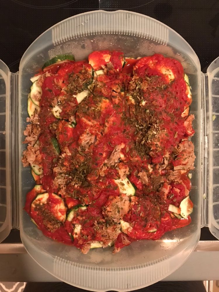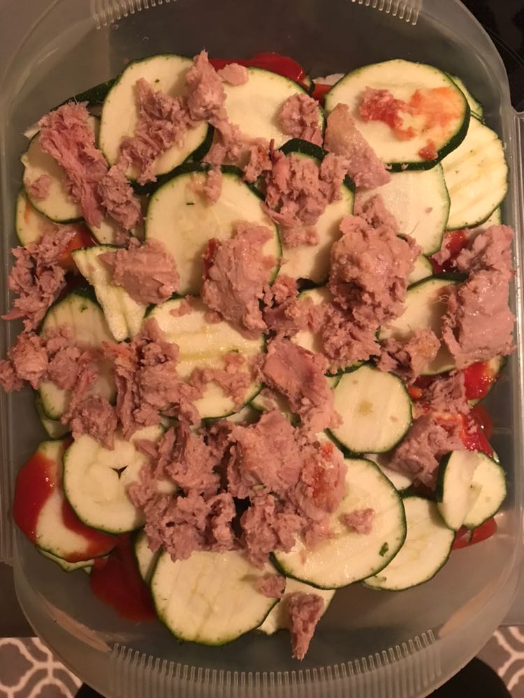 Escurrimos las latas de atún, sin conservar el aceite, y ponemos el atún más o menos desmigado por encima de los calabacines laminados. Cubrimos el conjunto con la mitad del tomate frito.