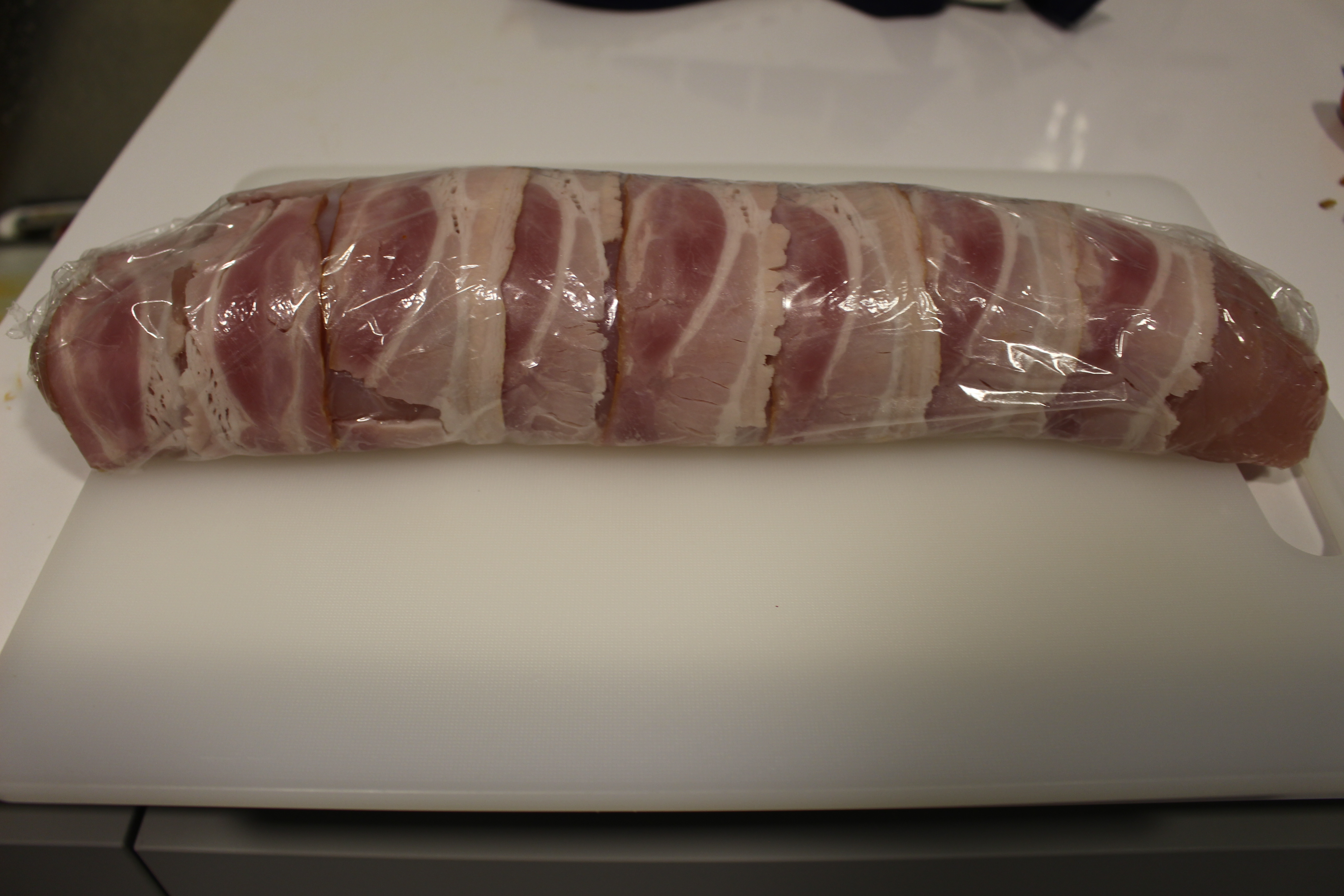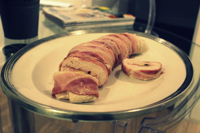 Ayudándonos del film, enrollamos la pechuga con todo como si fuera un brazo de gitano, empezando por el lado más largo del film (en sentido perpendicular al bacon).