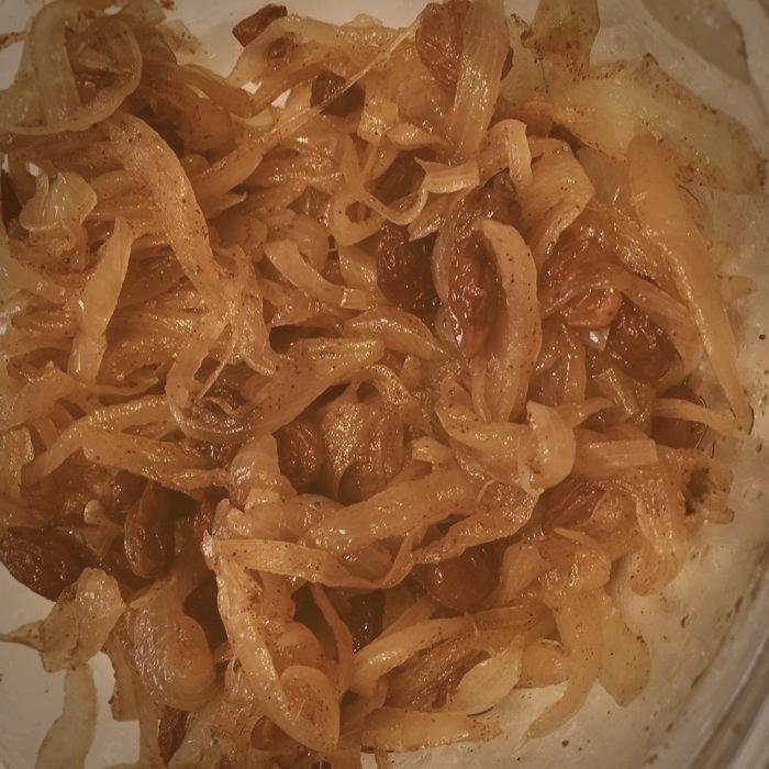 - Cebolla caramelizada como guarnición para el fiambre: antes de colocar el recipiente varoma con el rollo de pavo crudo tenemos que hacer un par de cosillas: ponemos 700 gr de cebolla (cortada en cuartos) en el vaso de la thermomix y troceamos 6 seg/vel 4; bajamos hacia el fondo la cebolla que haya quedado por las paredes del vaso; incorporamos 70gr mantequilla + 30gr aceite de oliva + un puñadito de pasas (opcional). Ahora ya pondríamos el recipiente varoma (con el rollo dentro) encima del vaso de la thermomix sin cubilete y programaríamos 40min/temperatura varoma/ giro a la izquierda/ velocidad cuchara. Cuando haya pasado el tiempo, retiramos el varoma y terminamos de hacer la cebollita: añadimos al vaso una cucharadita de sal, 30 g de caramelo líquido y un pellizco de pimienta, y programamos 3 min/100°C/vel 1.