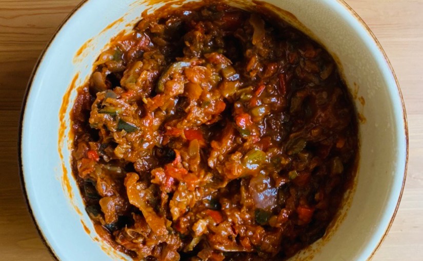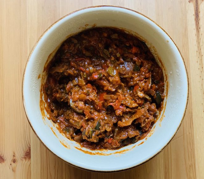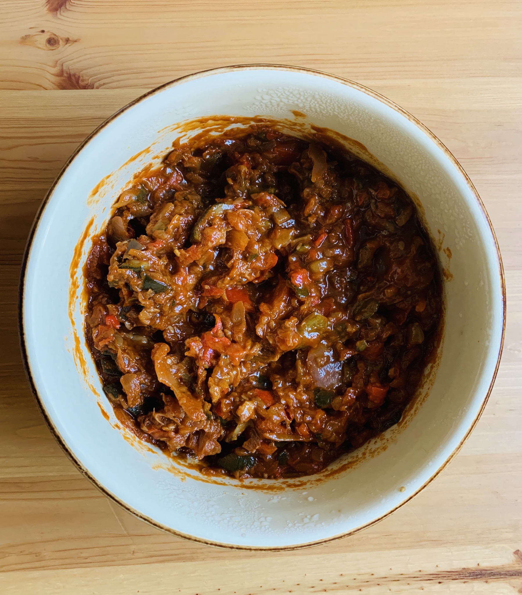 Añadimos a la thermomix (junto con las berenjenas recién cortadas) el aceite y las otras verduras reservadas y programamos 15 minutos a temperatura Varoma, giro a la izquierda y velocidad cuchara.