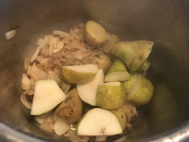 Añadimos las dos patatas y las peras (ambas lavadas pero sin pelar) cortadas en trozos medianos. Dejamos que se doren un poco con la tapa cerrada unos 7 minutos.