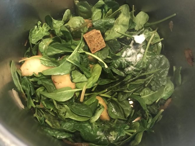 Posteriormente, añadimos agua cubriendo 2 dedos por debajo las verduras (no mucha, las espinacas sueltan muchíiisima agua ) y dejamos hirviendo durante unos 20 minutos en olla normal u 8 en olla express.