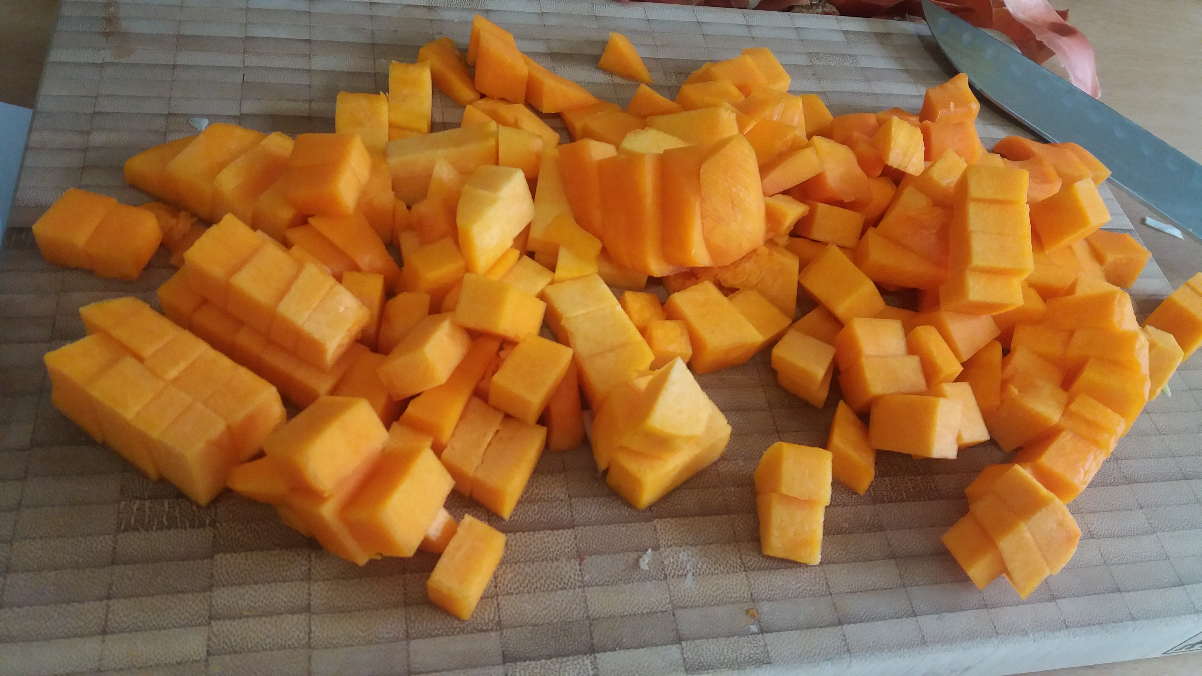 Cortamos la calabaza de manera que quede en cuadraditos de 1 cm aprox: