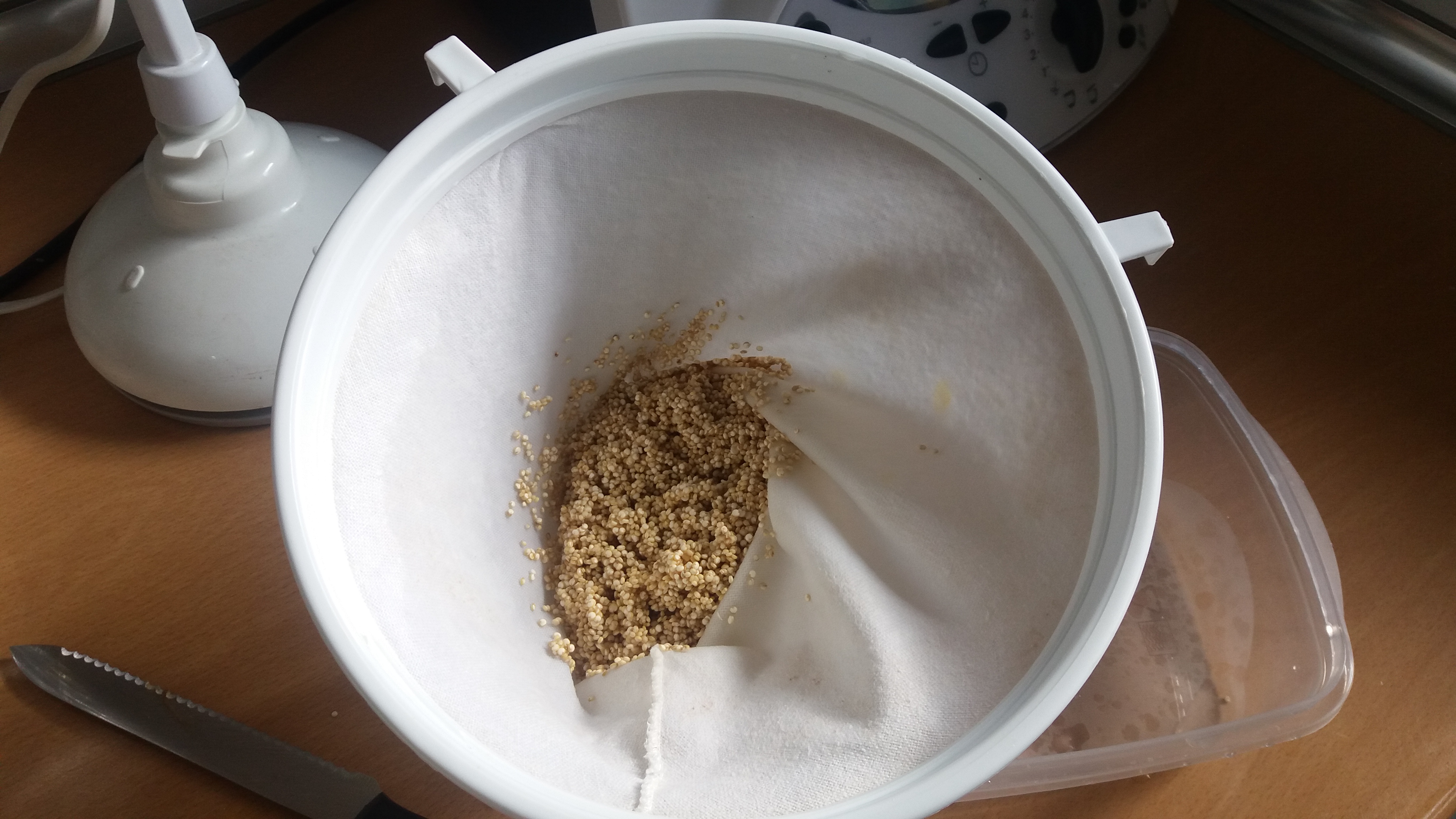 - 300 gr de quinoa – ya os he hablado de ella en multitud de ocasiones – pseudocereal sudamericano que muchos califican de «superalimento»; ya la venden en todas partes: aparte de en herbolarios, yo la he encontrado a «buen» precio (alrededor de 3€/500gr en Hipercor, Leclerc y recientemente en Mercadona). Si por lo que sea queréis hacerlo con 300gr de arroz, perfecto!