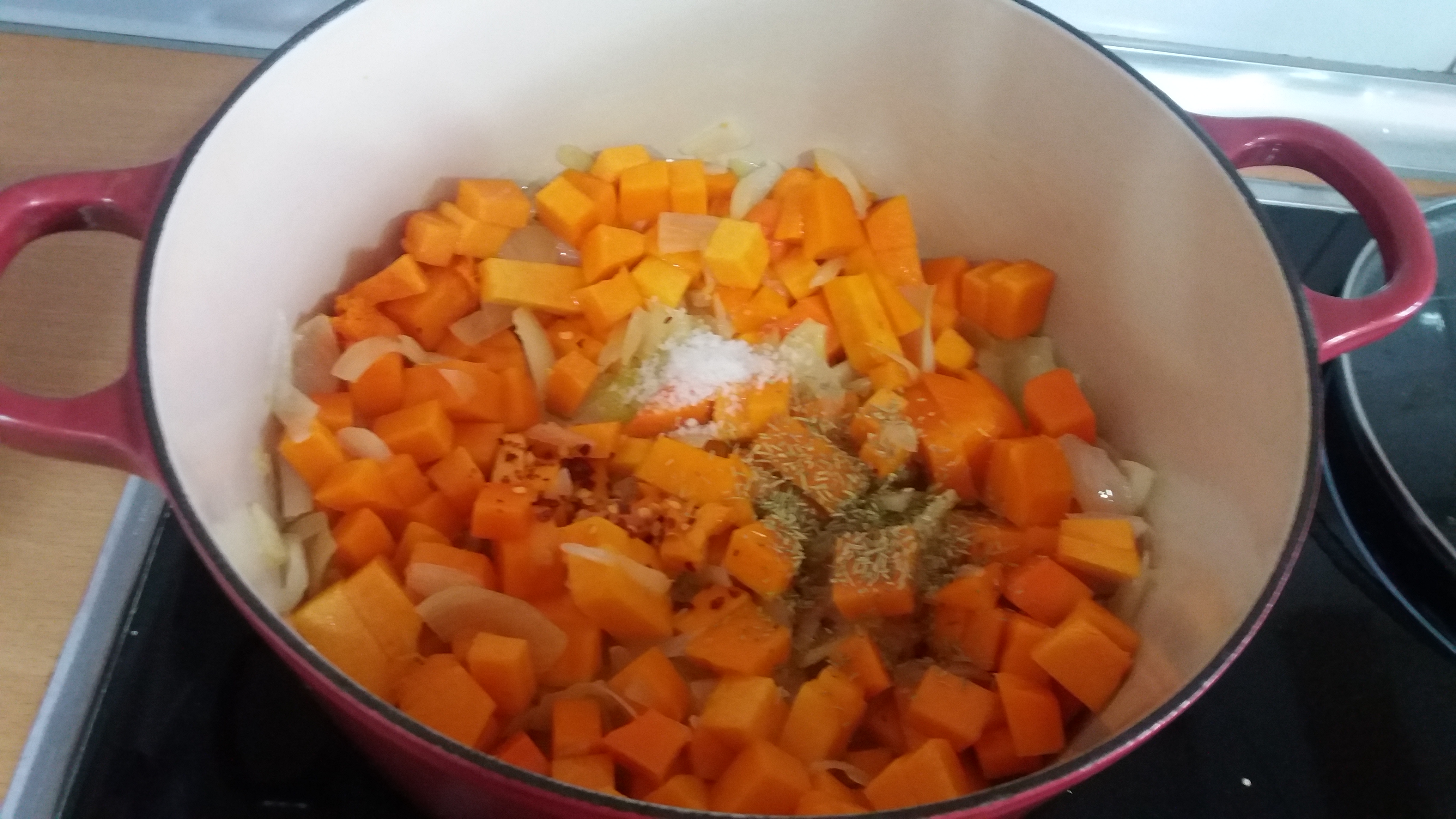 La añadimos a la cazuela donde está la cebolla pochada, junto con la guindilla, el romero y la sal y rehogamos durante 7 minutos dando algunas vueltas: