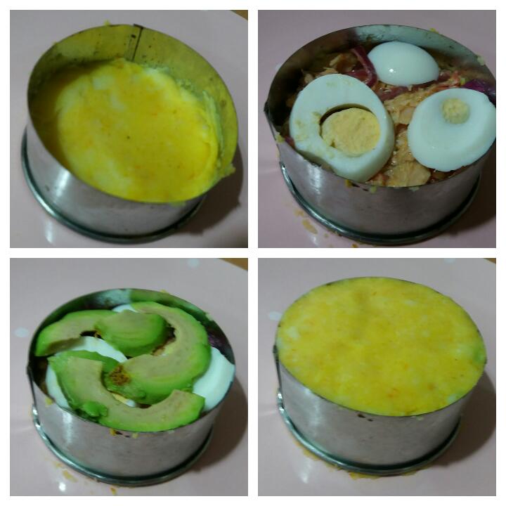 Colocamos el aro en el plato donde vayamos a servirlo, y colocamos con una cuchara: capa de puré de patata muy aplastada >> cebolla+atún >> huevo >> aguacate >> otra capa de puré de patata: