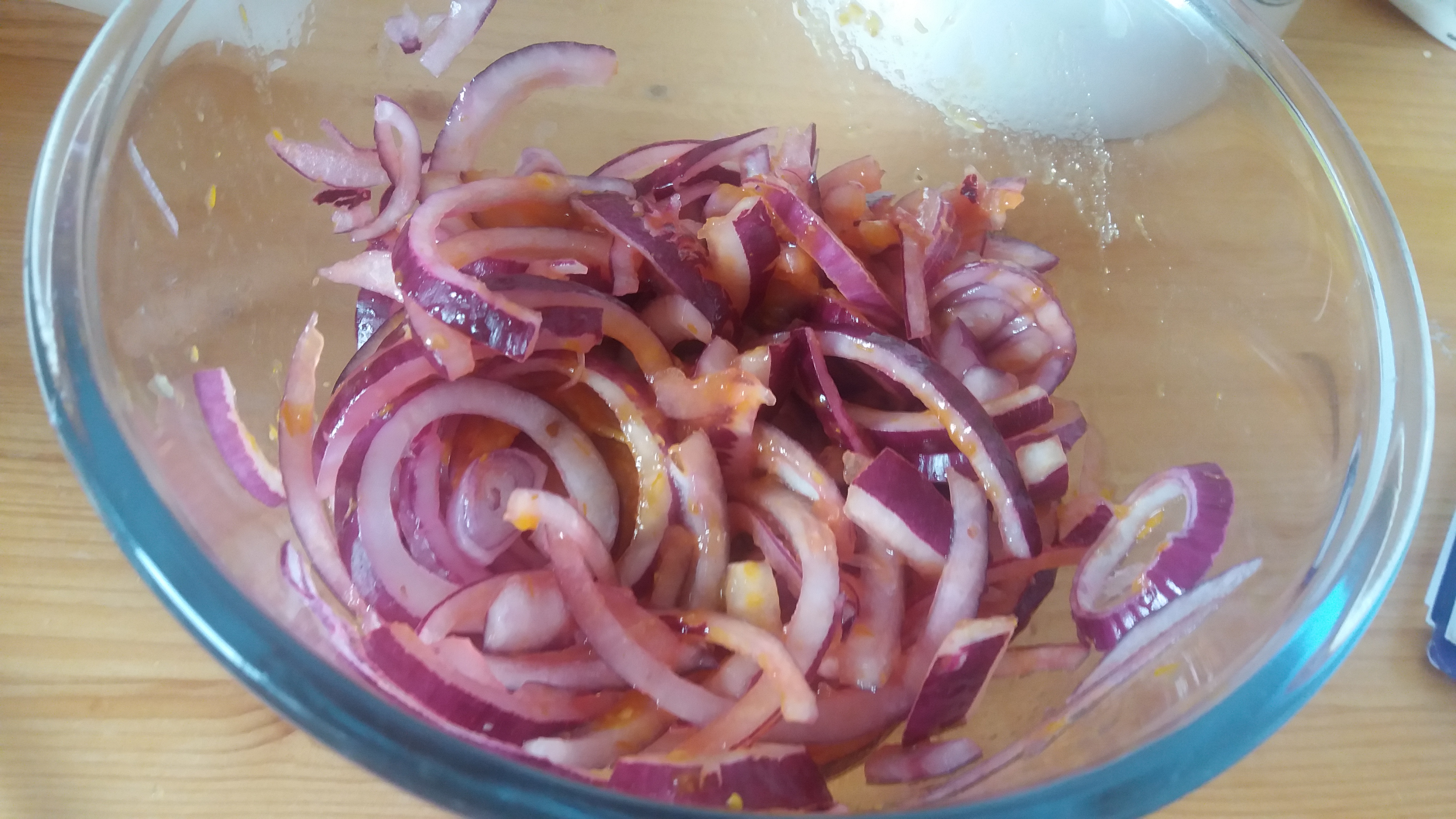 Por otro lado, ponemos a macerar un rato la cebolla (pelada y laminada) en una cucharada de ají y el zumo de medio limón: