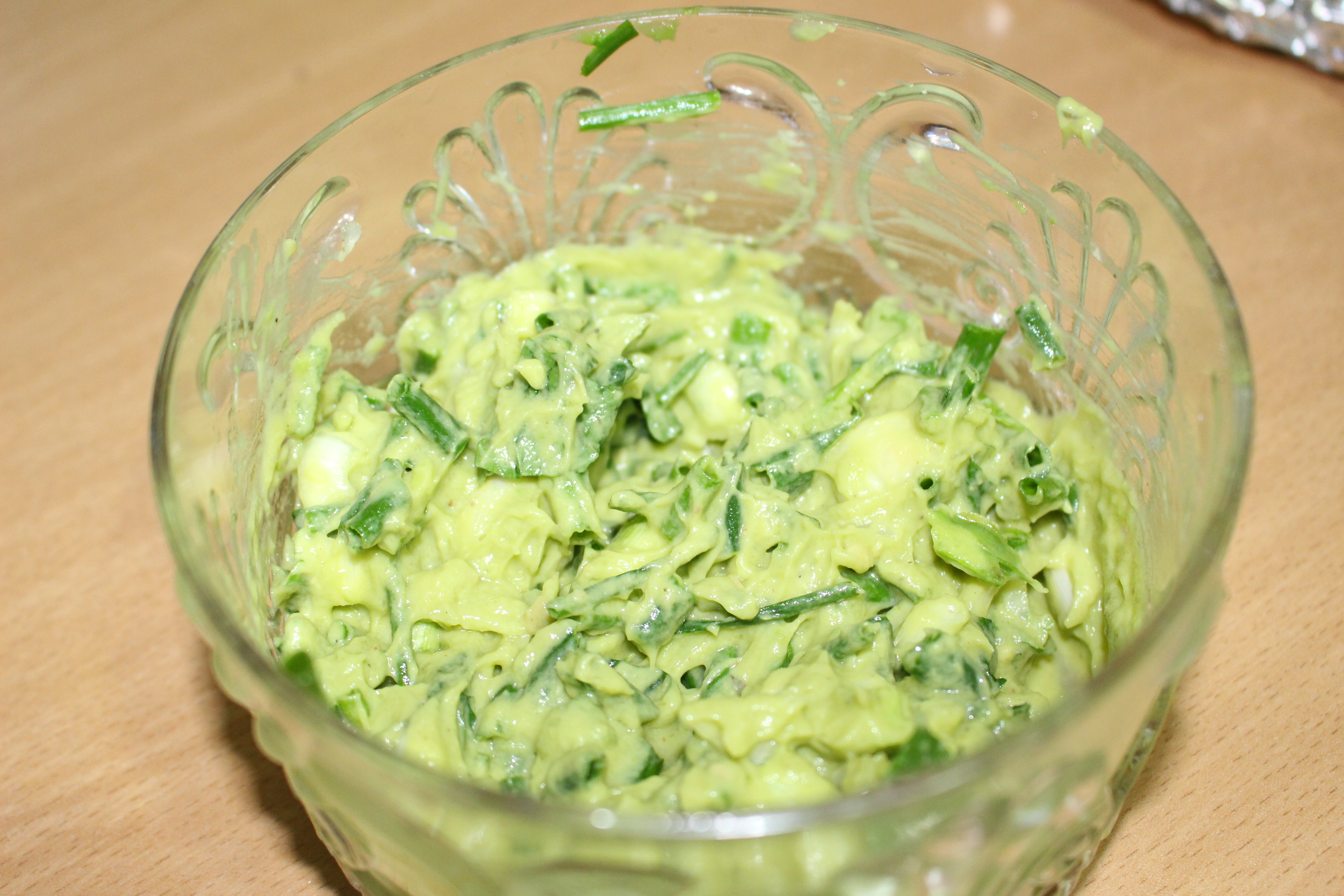 A continuación incorporamos las cebolletas+cebollino+menta al cuenco del aguacate y mezclamos bien con una cuchara o espátula: