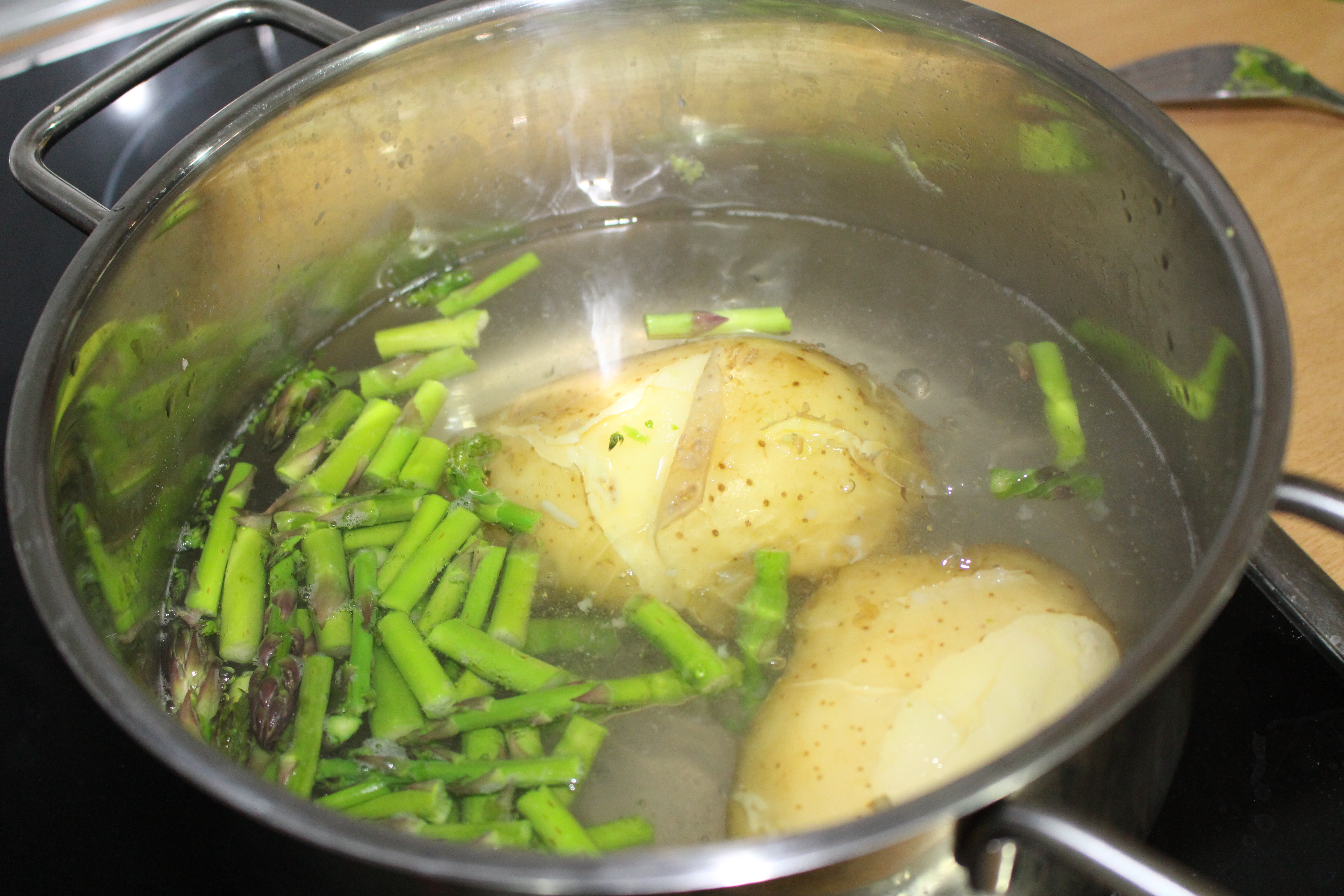Cuando penséis que están cocidas las patatas, las atravesáis con un cuchillo o palillo, y si están blanditas las retiramos; si no, las dejamos otro rato más. Podemos aprovechar para poner los espárragos a cocer mientras están dentro las patatas, cuando veamos que les falta muy poquito para estar bien tiernas. Escurrimos bien todo y lo pasamos por un chorro de agua fría, para cortar la cocción. Nuevamente, si utilizáis garbanzos en lugar de patatas, esto no plicaría, coceríamos los espárragos por separado.