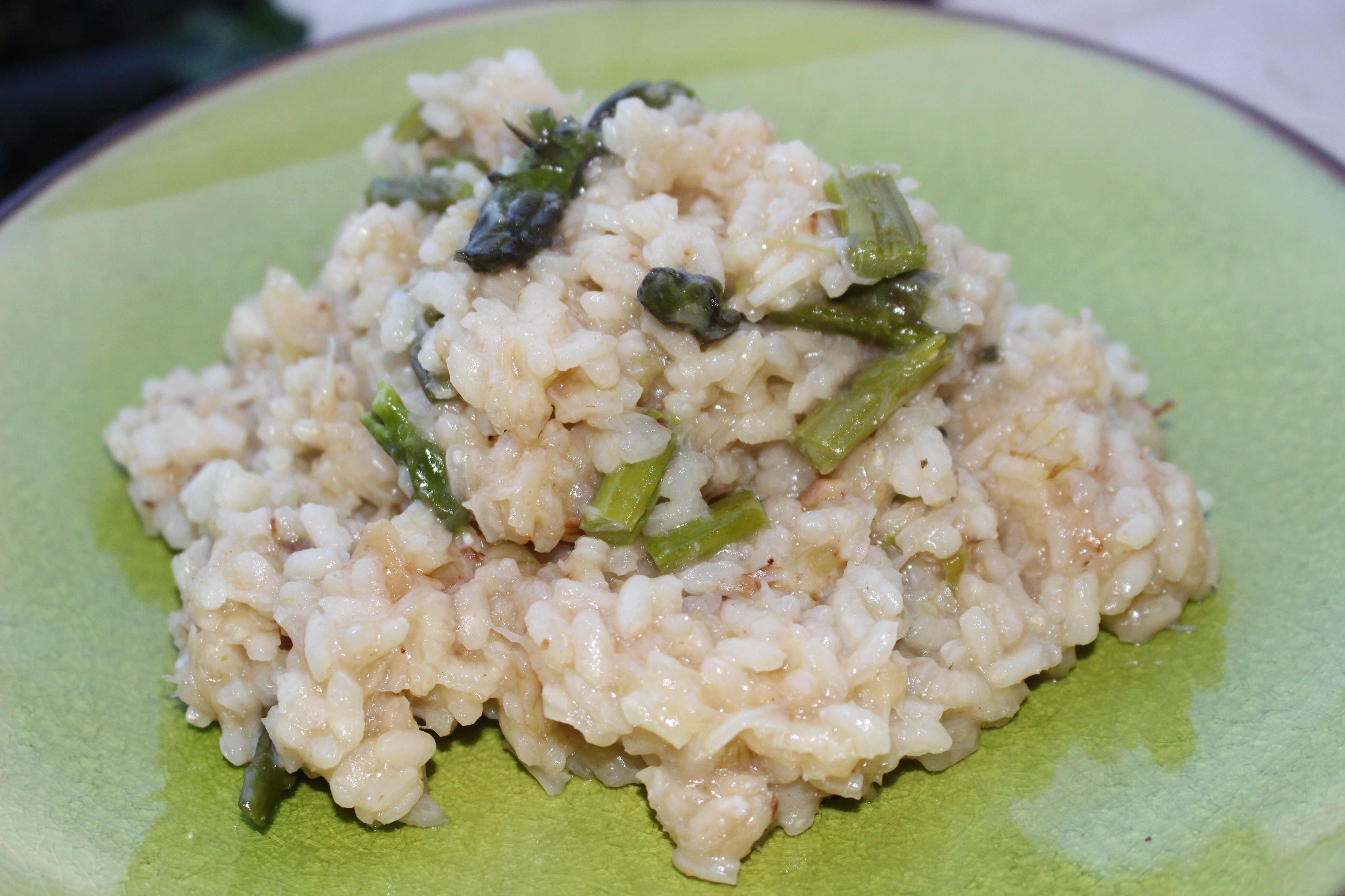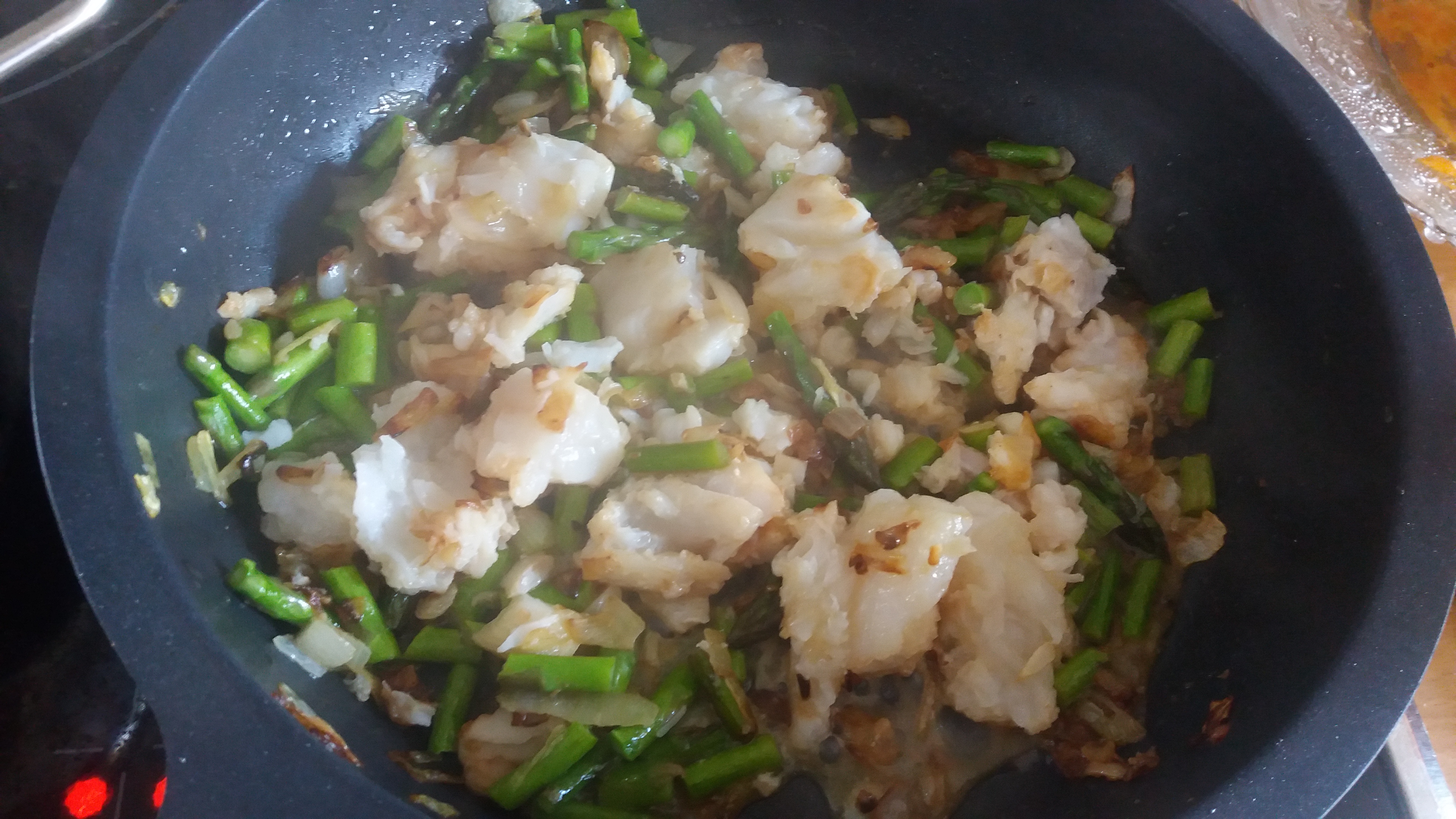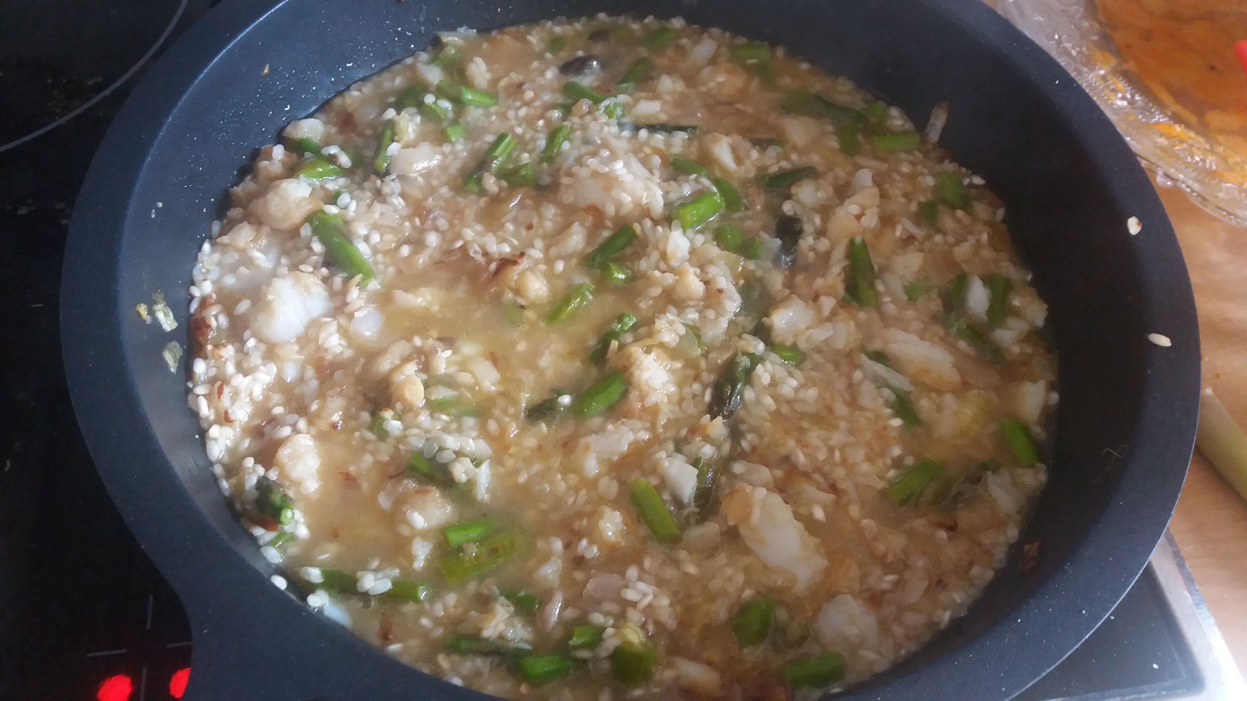 Es un arroz que calificaría de «semiseco», que aunque en la clase lo preparamos tipo paella (seco), como yo no tengo el artilugio he optado por darle un poco más de cremosidad. Buenísimo, no imaginaba que los espárragos y el bacalao fuesen a ser tan buenos amigos 🙂 .