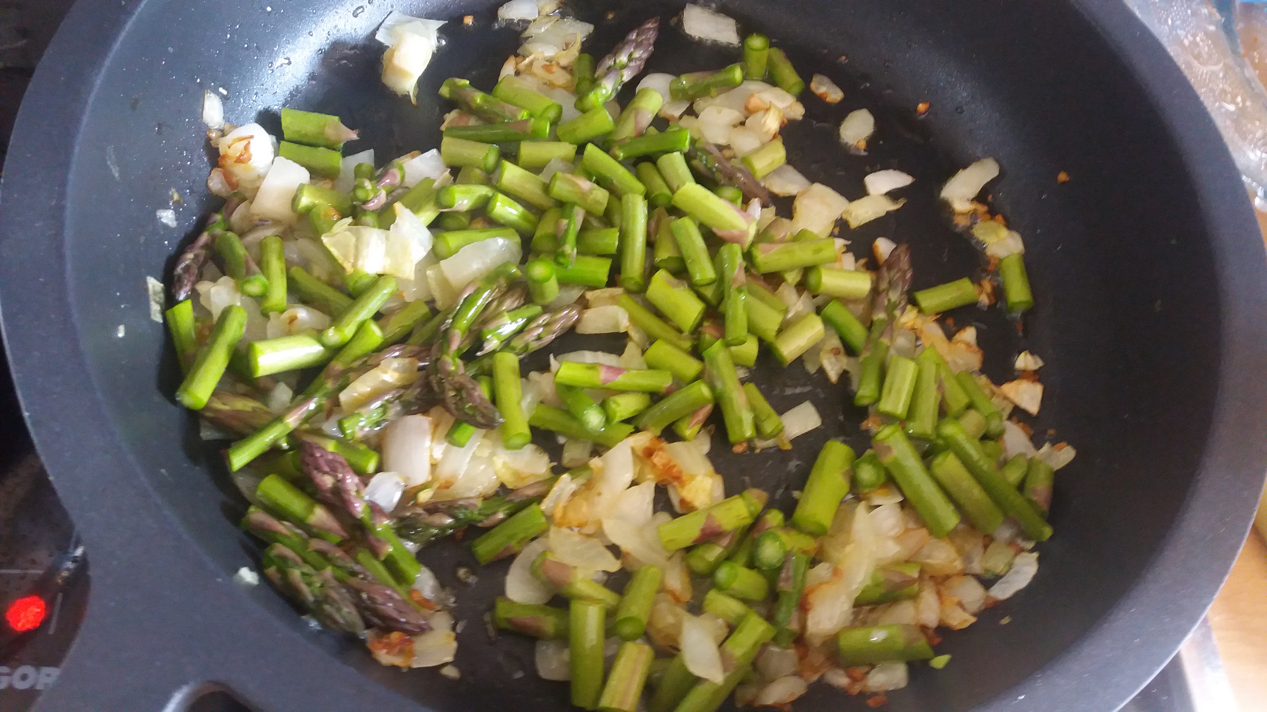Lo dejamos tapado durante 10 minutos, removiendo de vez en cuando, y mientras vamos lavando y cortando los espárragos en trozos de 2 dedos de longitud, desechando un buen trozo del final (es desagradable de comer, demasiado leñoso…). Subimos un poco el fuego, los incorporamos a la cazuela y los doramos durante 5 minutos por todos lados, removiendo: