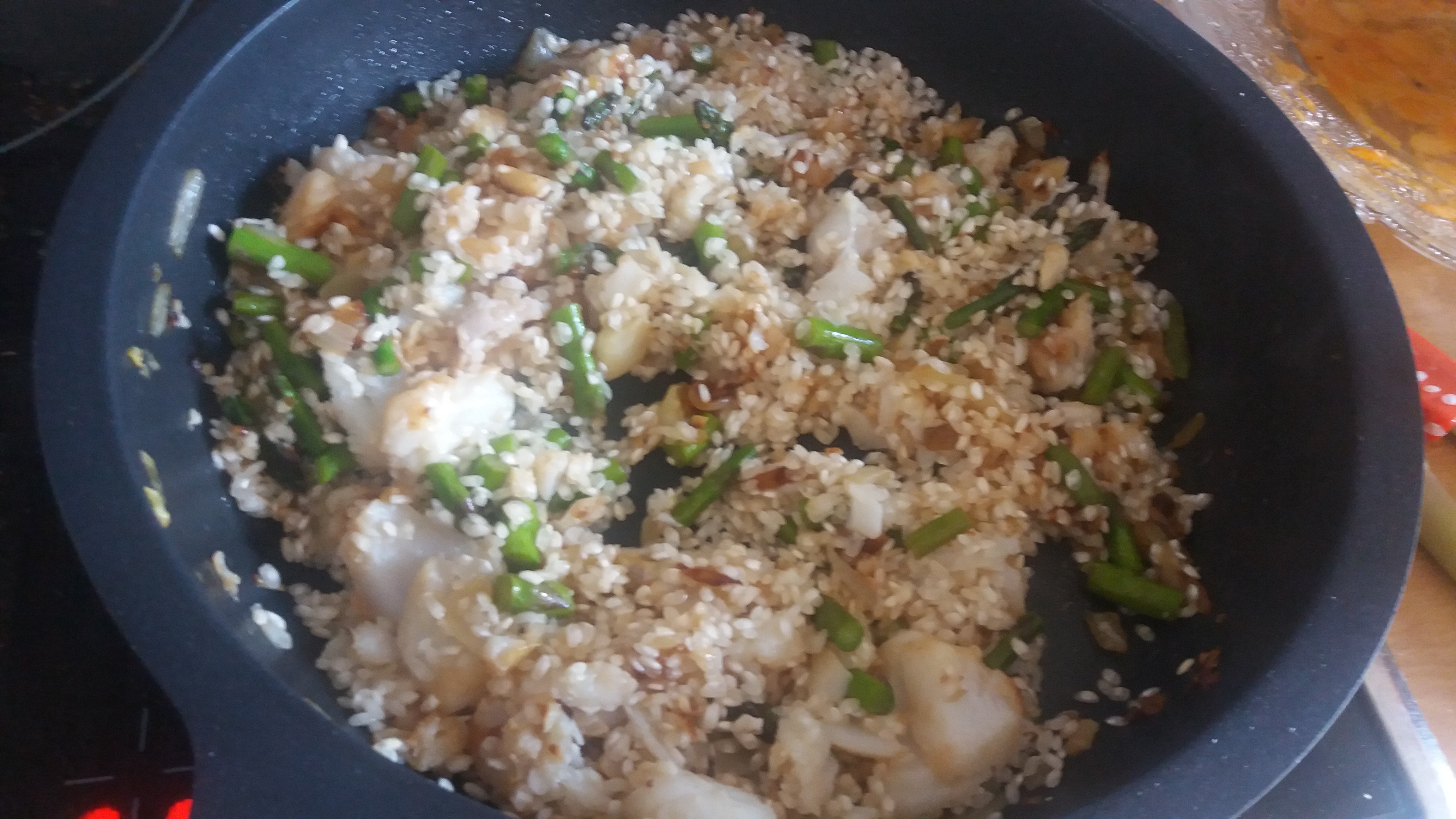 (*) Podéis dejar hecho el arroz de antemano hasta este punto. Cuando vayáis a tomarlo, retomáis el asunto en ese punto. Puede ser el mismo día, o incluso al día siguiente o 2 después!