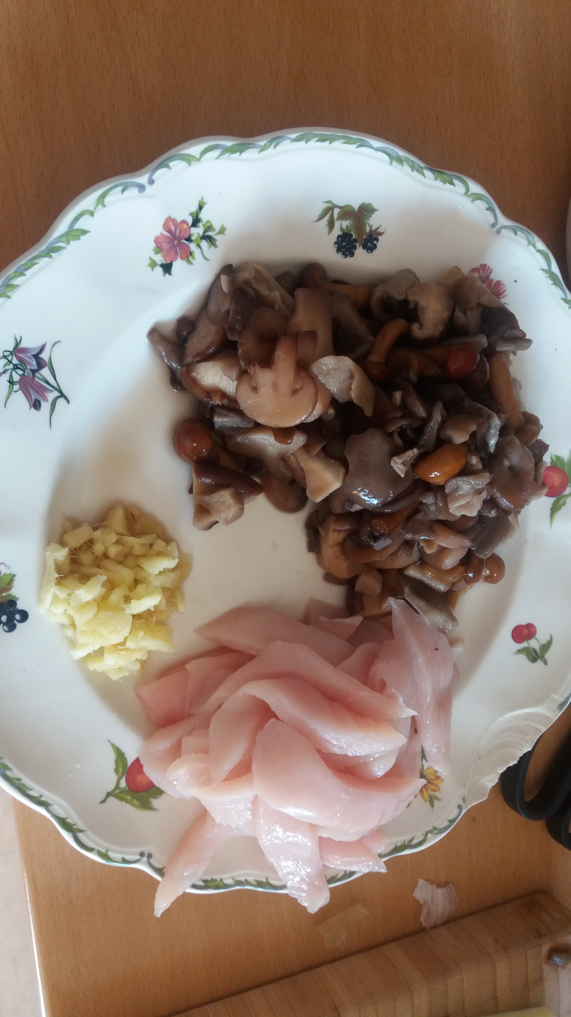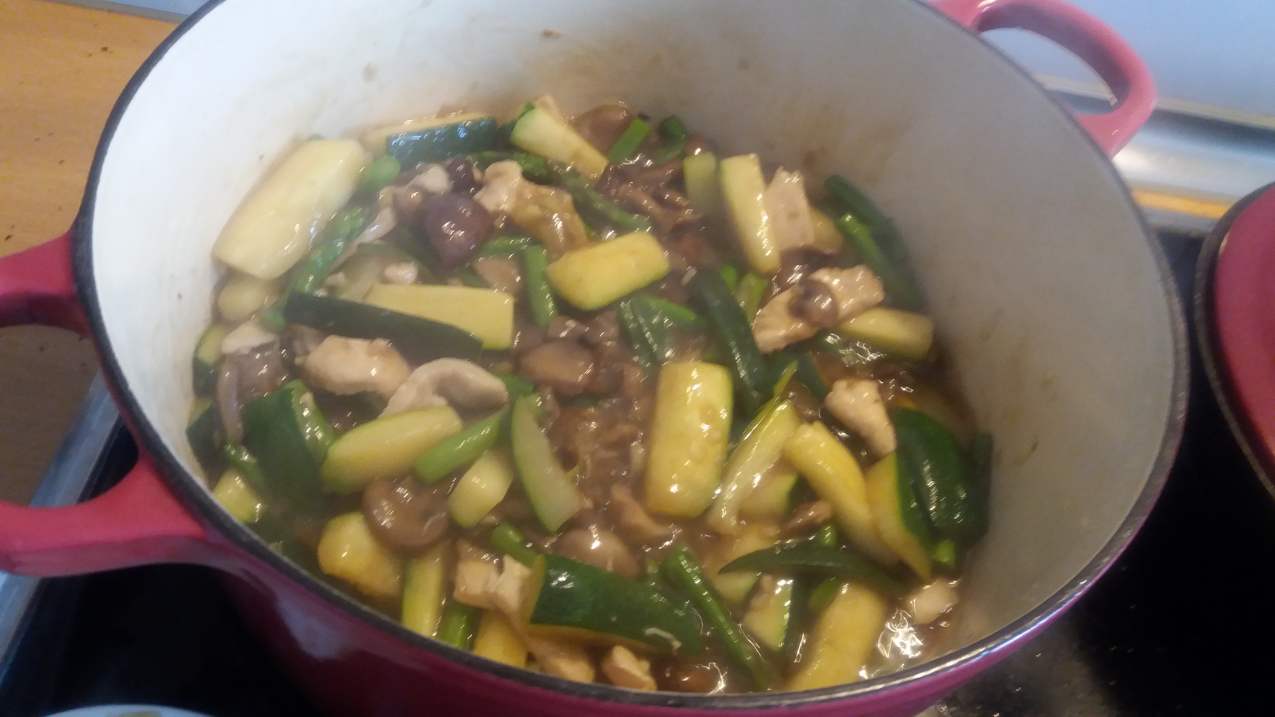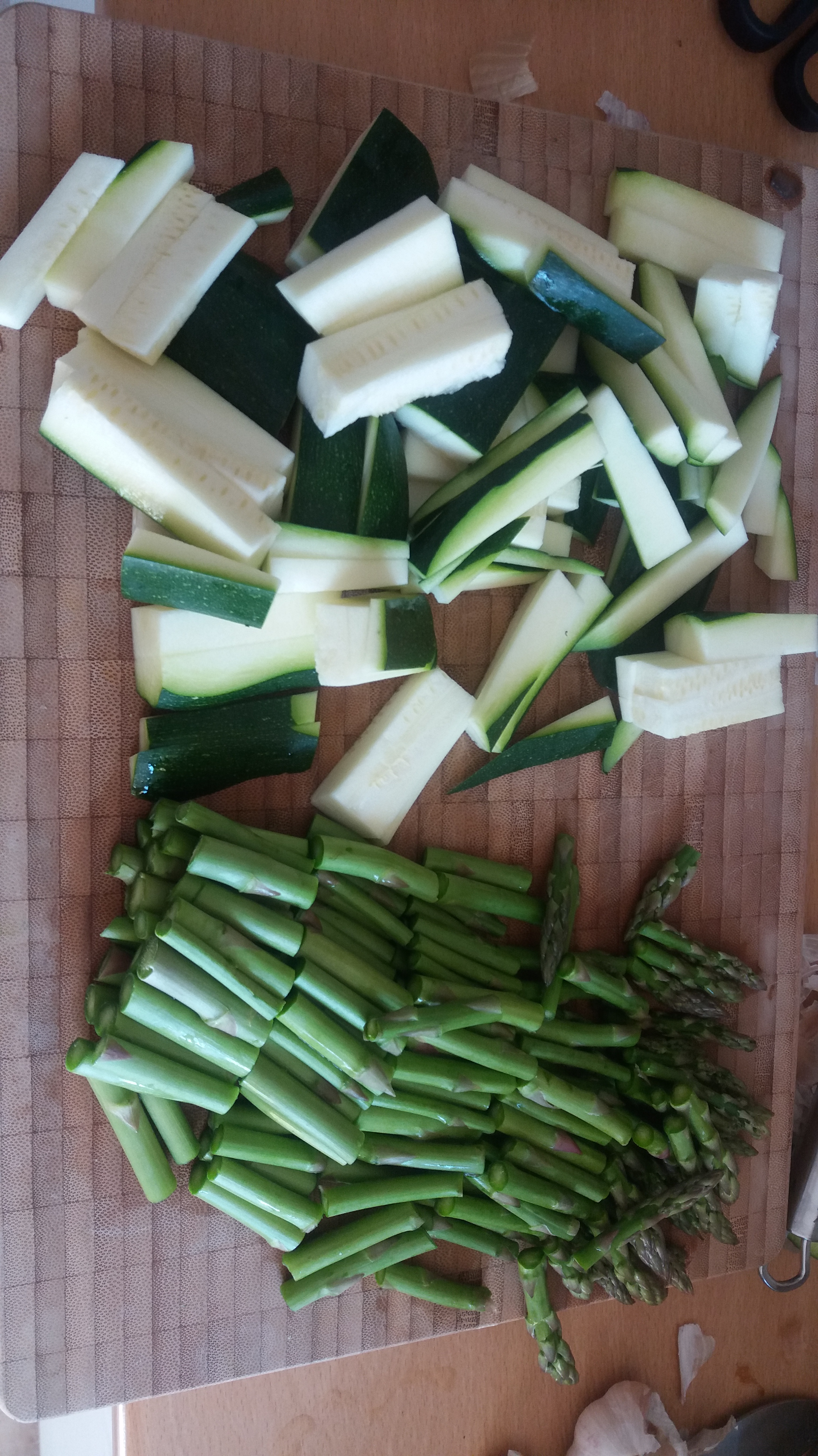 - 200-300 gr de verduras varias como setas, champiñones, espárragos verdes, calabacín, cebolla, zanahoria, brócoli… mejor no berenjena o tomate (no quedan muy allá). Venden variados de verduras ya cortadas en bastoncitos de lo más apañados, en la zona de las lechugas (refrigeradas)