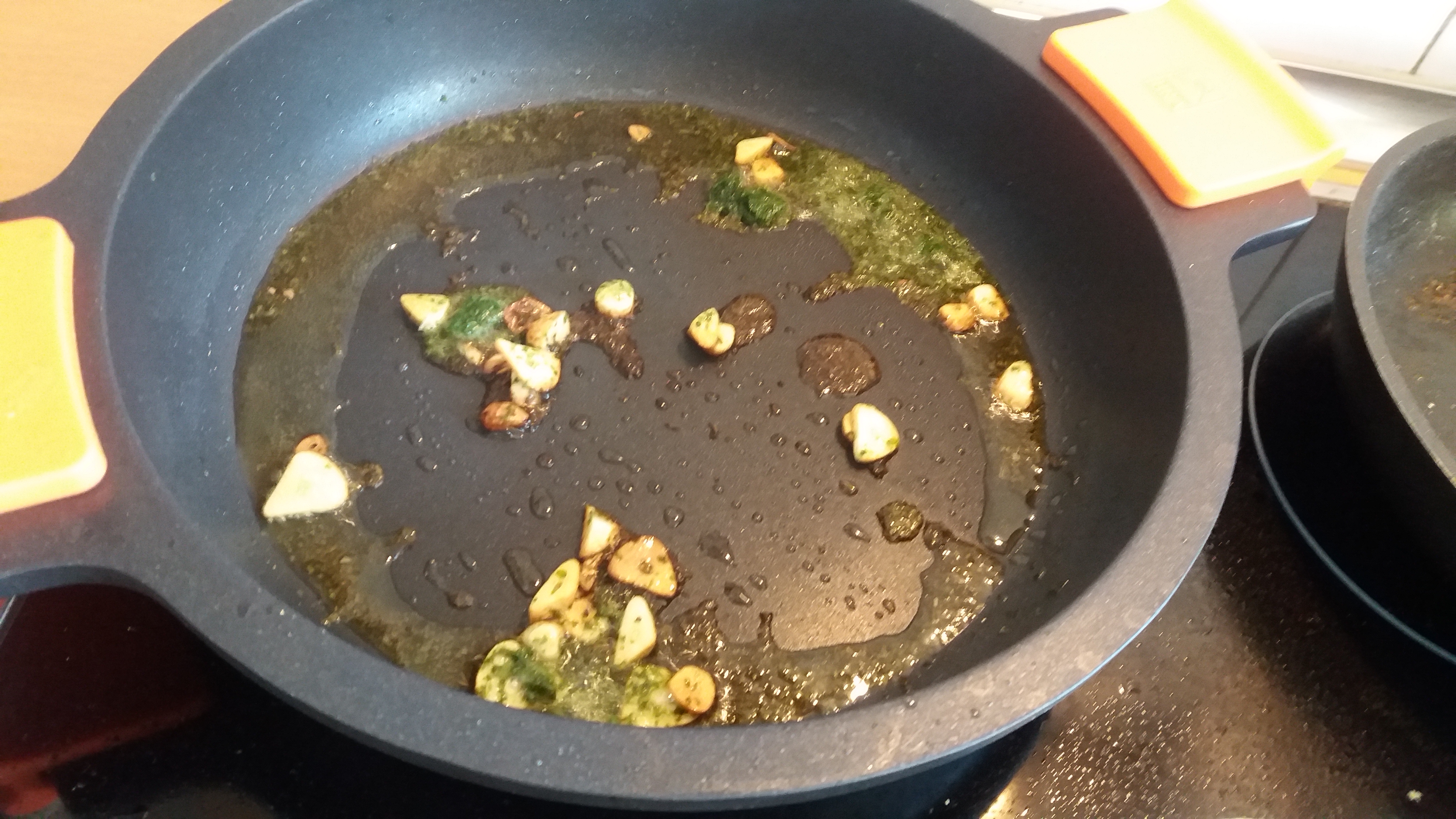 Cogemos una cazuela u olla y ponemos un chorro de aceite de oliva a calentar a fuego medio. Agregamos los dientes de ajo y el perejil muy picaditos y dejamos que se sofrían suavemente: