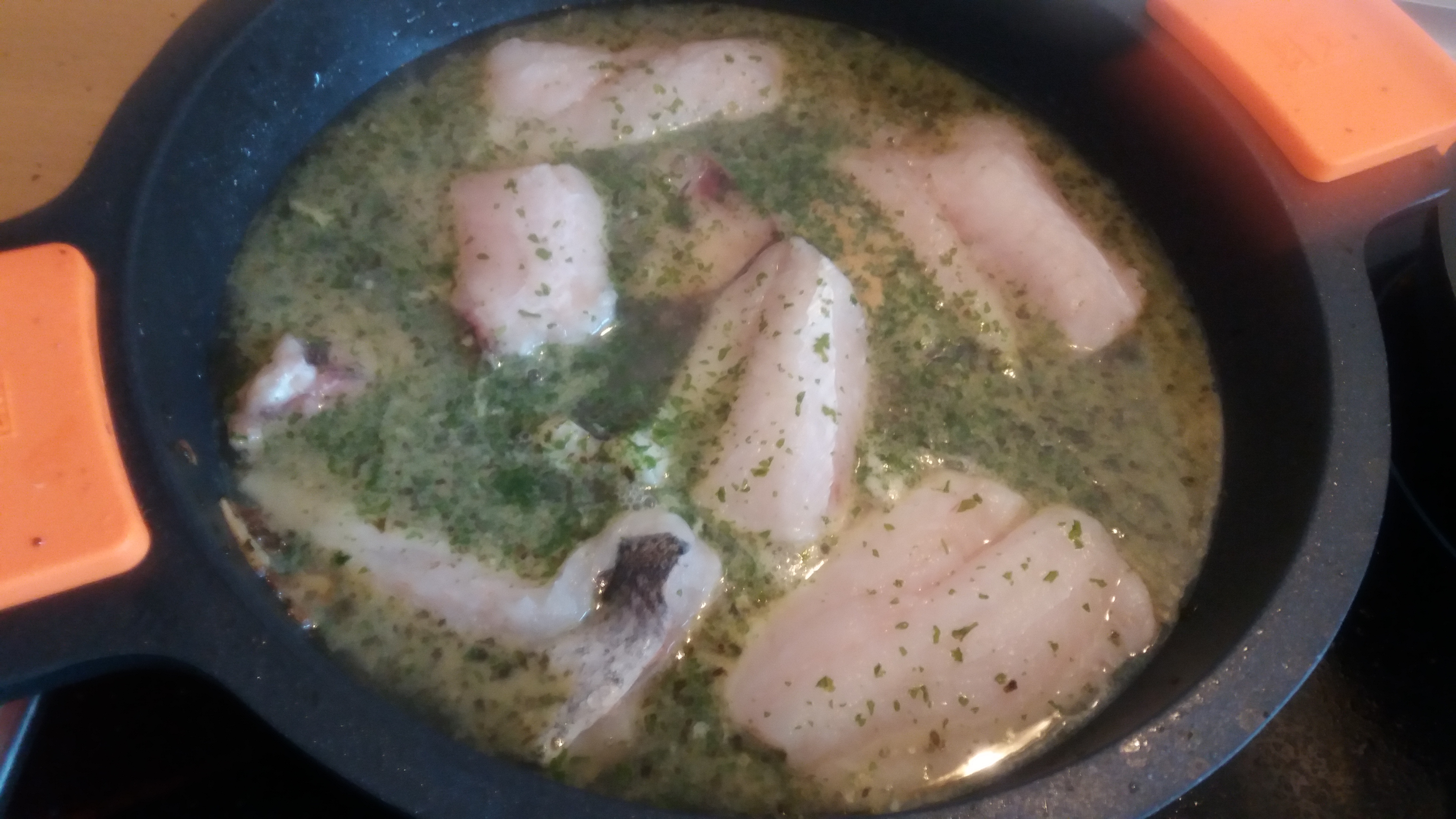 Añadimos la maizena disuelta y el resto del caldo a la cazuela y, cuando esté caliente, incorporamos la merluza descongelada (OJO, la merluza fresca debemos haberla tenido congelada como mínimo 2 días). Cuando pase 1 minuto le damos la vuelta a cada trozo y dejamos otro minuto:
