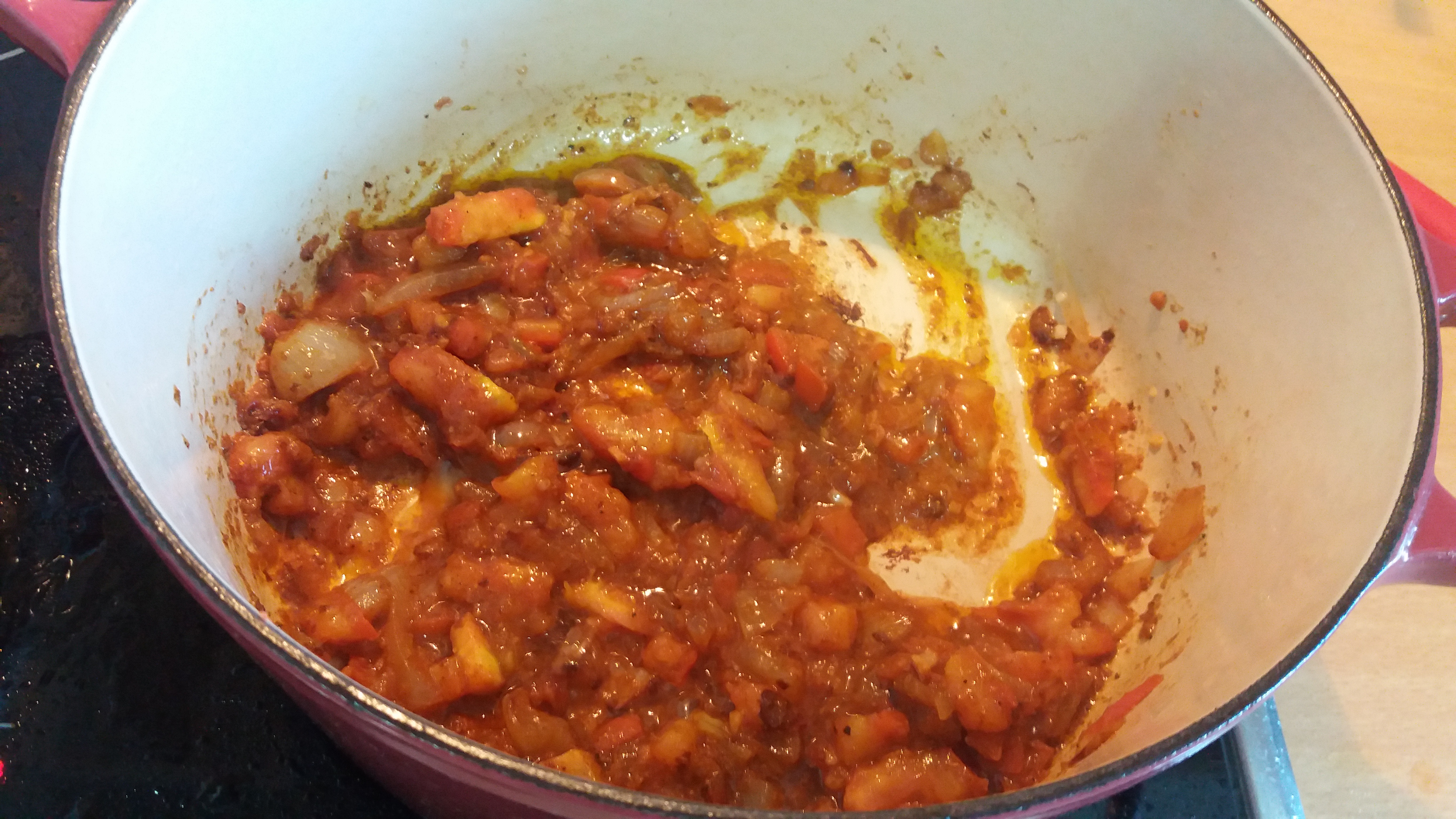 Lo dejamos 5 minutos y añadimos las especias o el triguisar, o las especias por separado, removiendo a fuego suave 1 minuto:
