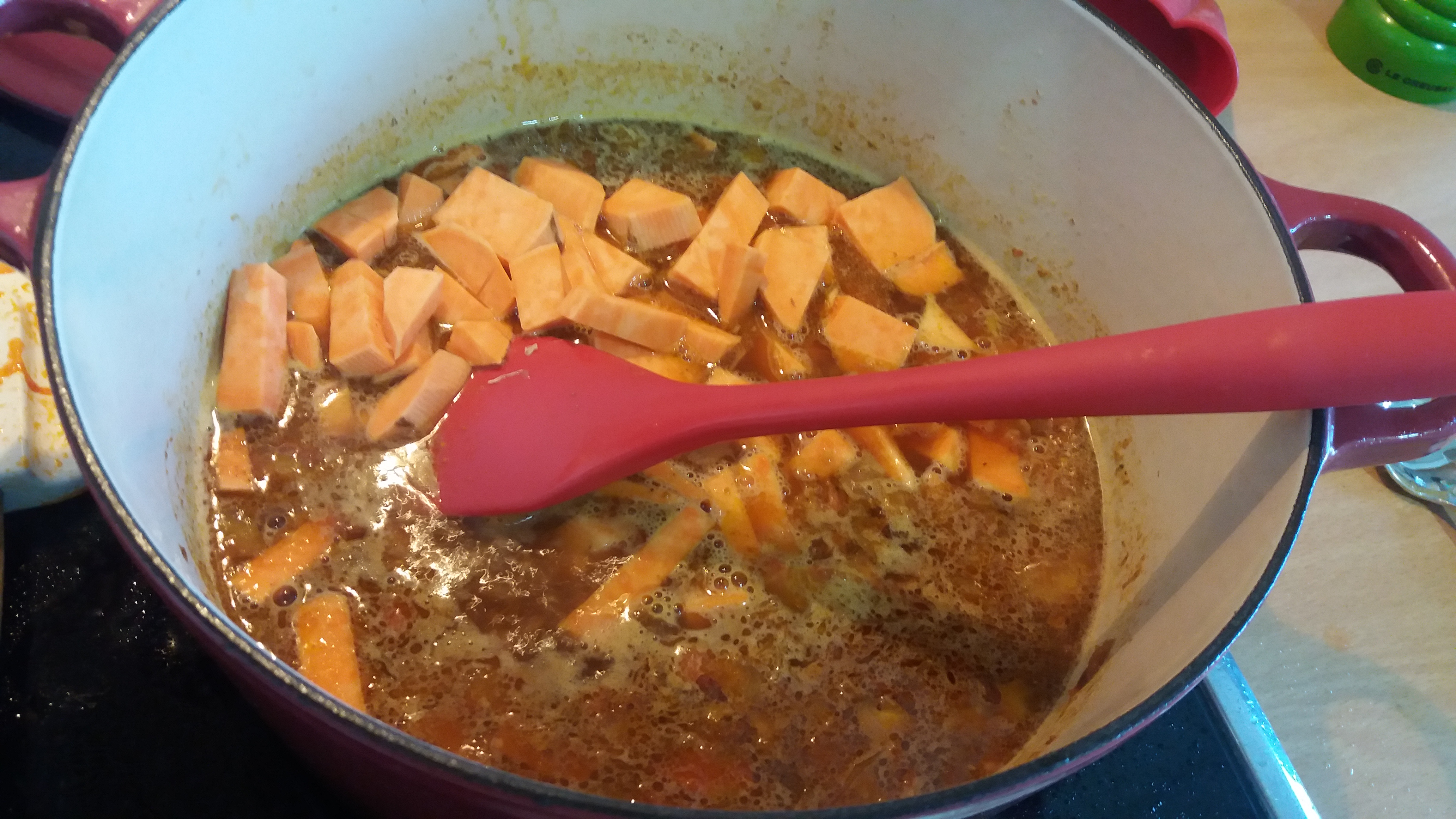Agregamos las patatas (o boniato) peladas y troceadas en cuadraditos y un vaso de agua y esperamos a que hierva: