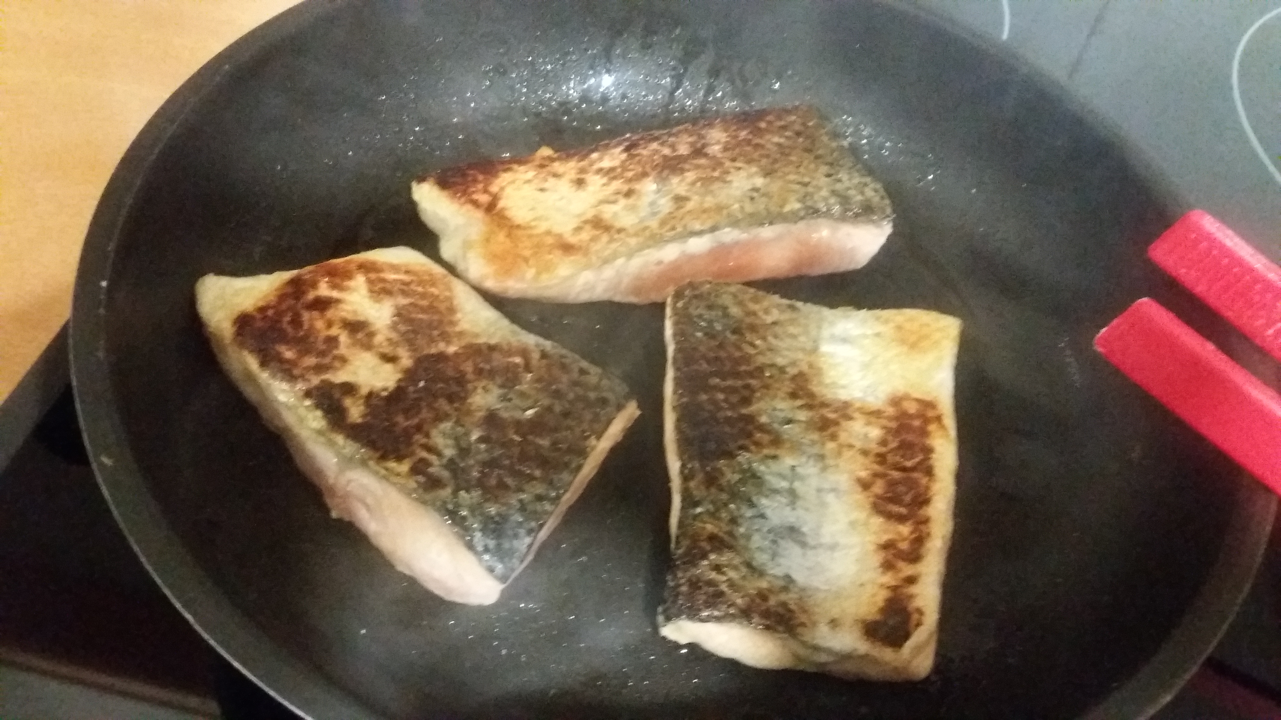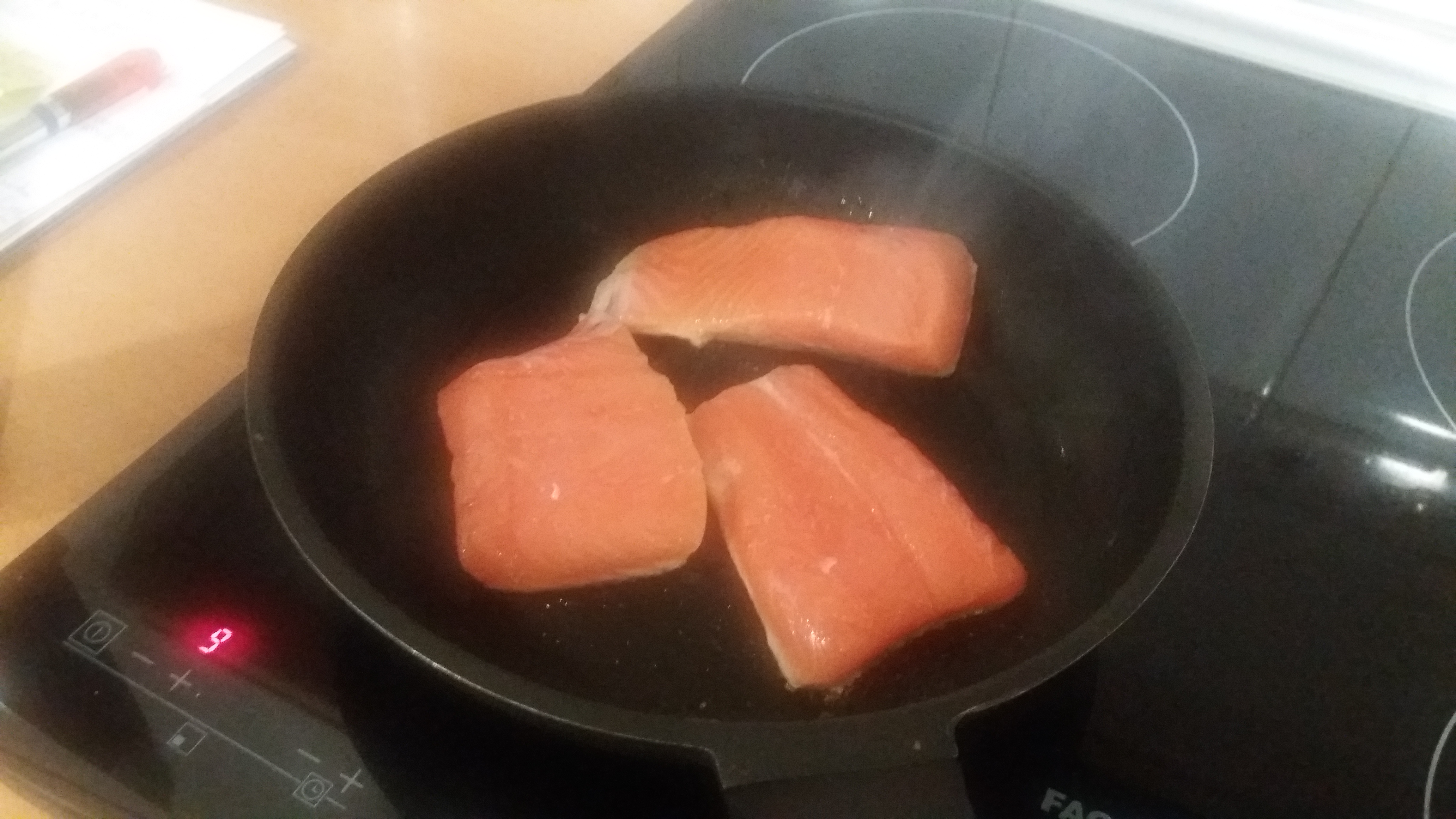 Calentamos un hilillo de aceite de oliva en una sartén antiadherente a fuego medio / fuerte y ponemos los lomos de salmón hasta que se cocinen por ambos lados. Si estaban en la nevera, poned el fuego suave al principio para que se hagan bien por dentro y después lo subís para que se doren. Cuidado que no quede muy seco!