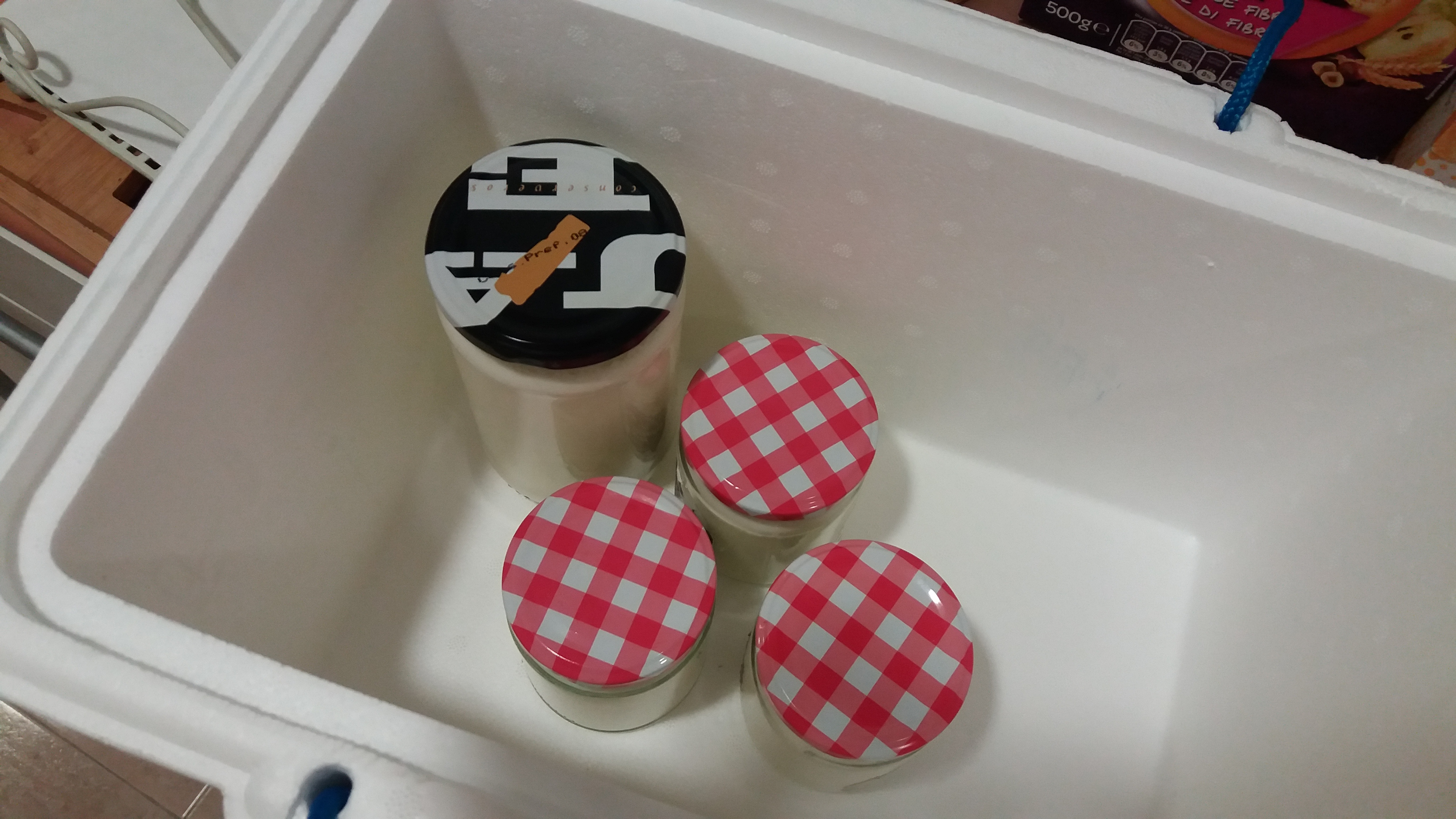 1. Metemos los botes dentro de una neverita de las de camping o playa envueltas con trapos o una mantita, cerramos la neverita y la dejamos quieta durante toda la noche en un lugar tranquila y sin grandes cambios de temperatura: