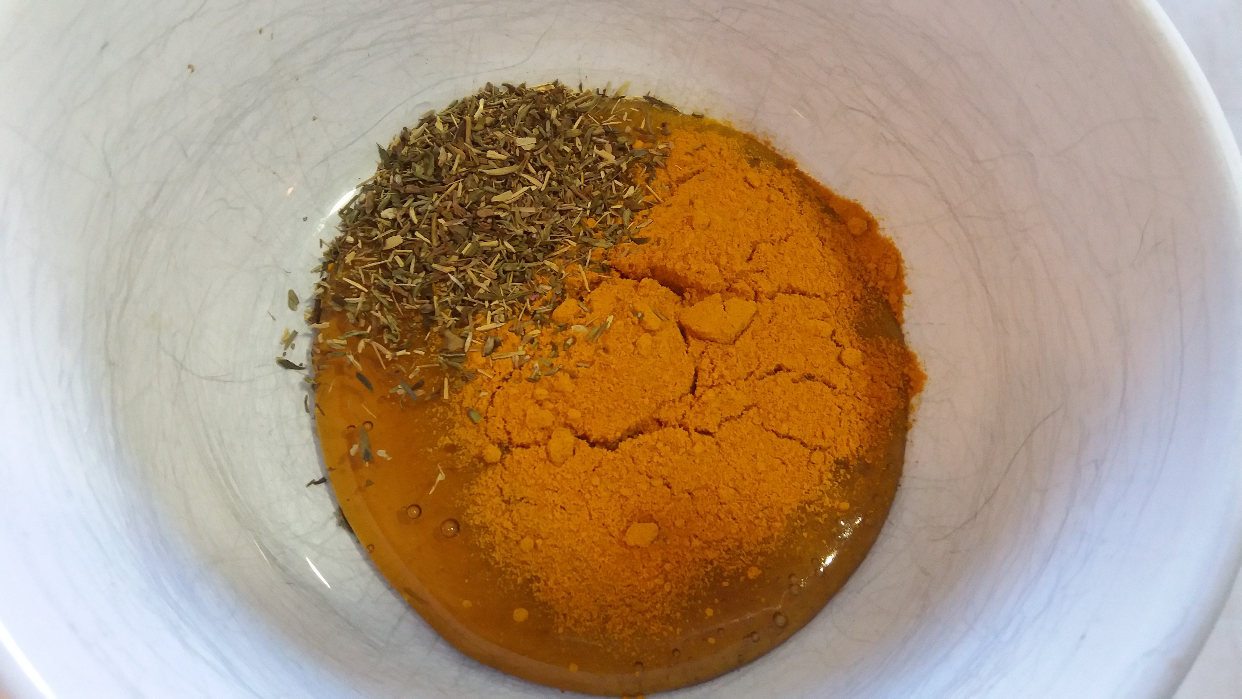 En un bol pequeño, mezclamos cúrcuma+miel+tomillo+sal+pimienta hasta formar una pasta untuosa:
