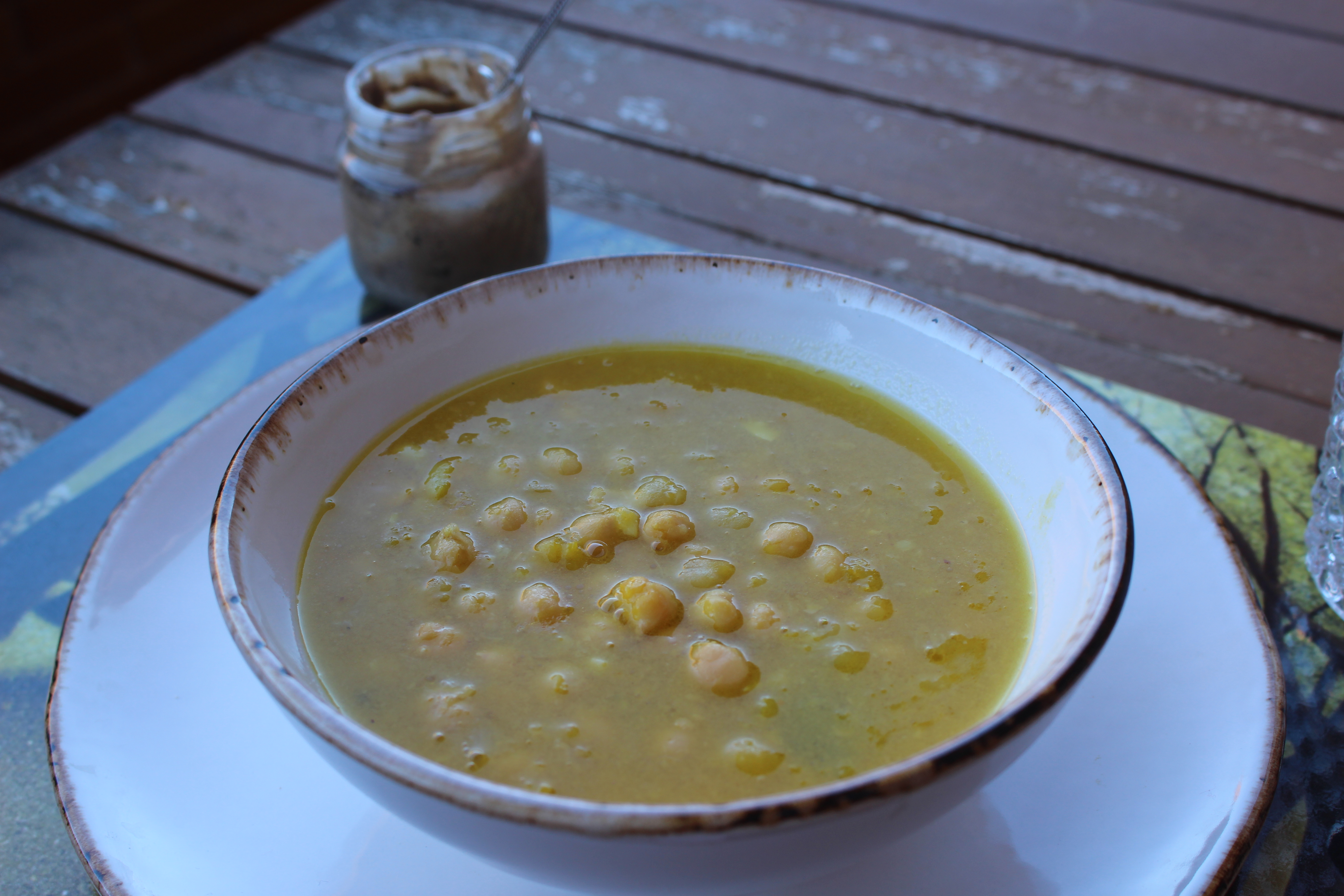 Ya estamos listos para servir este PLATAZO: disponemos el guiso de garbanzos en un plato hondo, y por encima ponemos una cucharada del alioli de ajo negro.