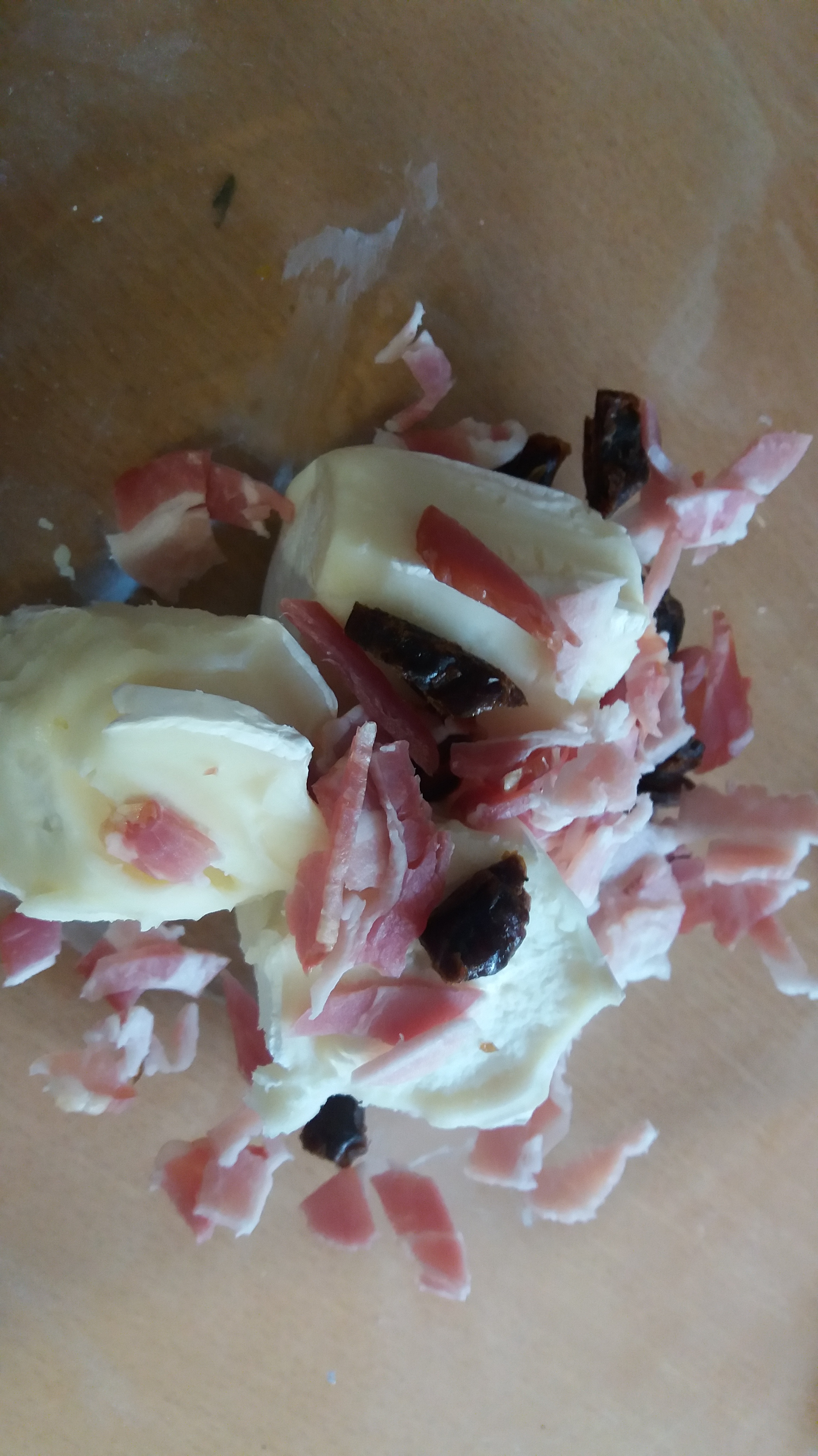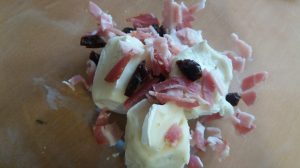 - Cortamos el bacon en trozos similares a los dátiles, desechando las partes blancas. Los ponemos en el cuenco.