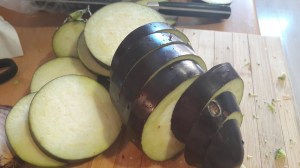 Comenzamos quitando el pedúnculo a las berenjenas y cortándolas en rodajas de 1 dedo de grosor (es interesante que queden gruesas para que sean melosas).