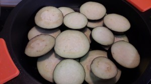 Tomamos una cazuela (a poder ser, baja), ponemos a calentar a fuego medio dos cucharadas de aceite y añadimos las rodajas de berenjena (no todas tocarán el fondo, algunas deberemos ponerlas amontonadas). Subimos el fuego y dejamos 3 minutos dándoles la vuelta a la mitad (para que se doren un poco todas).
