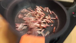 En una sartén o cazuela aparte, encendemos el fuego a fuego medio-fuerte y tostamos los taquitos de bacon, en su propia grasa. Cuando estén tostaditos, incorporamos las anchoas y dejamos a fuego medio 3 minutillos. Veréis que por arte de magia las anchoas se desintegran!