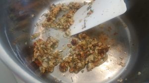 En la misma cazuela donde habíamos cocido la pasta, ya sin agua, ponemos un chorrito de aceite de oliva a calentar a fuego fuerte, apartamos del fuego e incorporamos los ajos picados, las especias y las guindillas. Esto lo hago porque cuando ponemos ajos tan pequeños se queman enseguida y pierden todo su aroma.