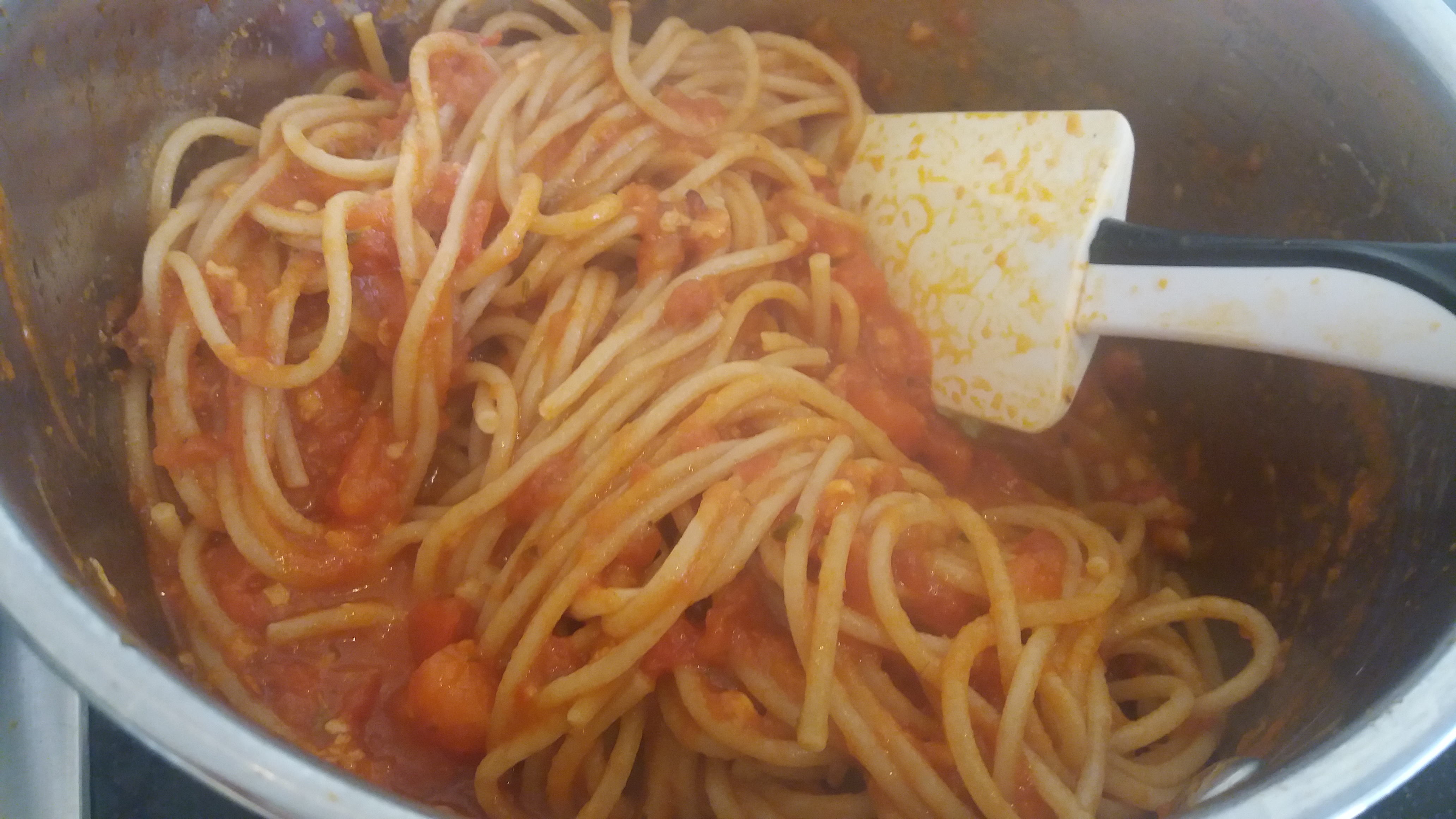 Volvemos a poner la cazuela al fuego (bajamos a fuego medio) e incorporamos el tomate crudo. Removemos. OJO, veis que no os indico que pongamos sal: el tomate frito ya lleva suficiente, y además la pasta va cocida con agua y el parmesano ayudará a salar más aún…