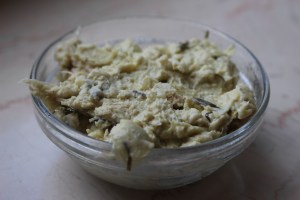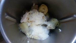 Ponemos en un cuenco grande o en una batidora tipo thermomix la mitad de las alcachofas, la mayonesa, zumo de limón y ajo. Trituramos hasta que sea cremoso y homogéneo.