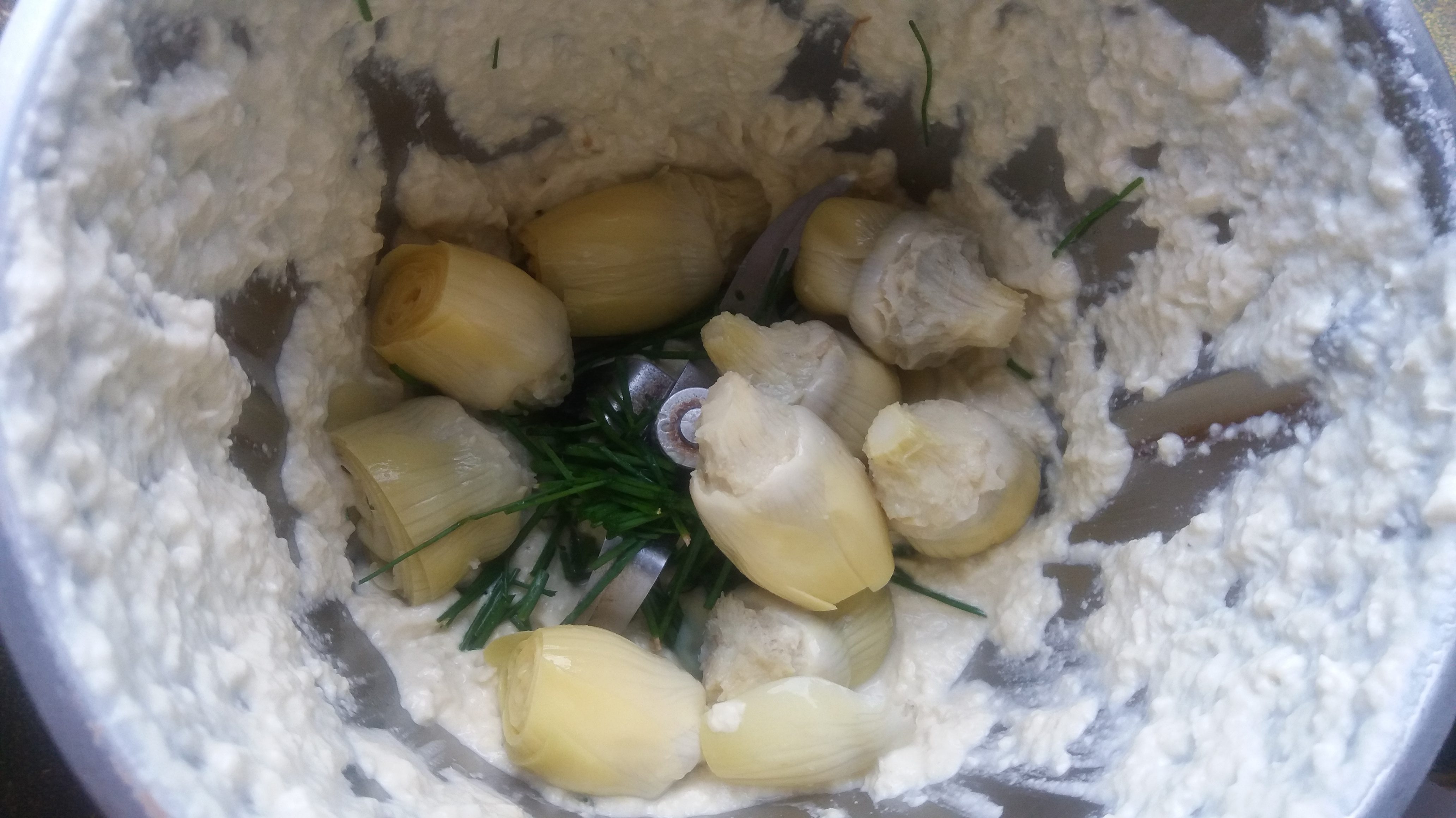 Incorporamos el resto de alcachofas y el cebollino previamente cortado en 4. Trituramos un poco, pero con la intención de que se aprecien trocitos.