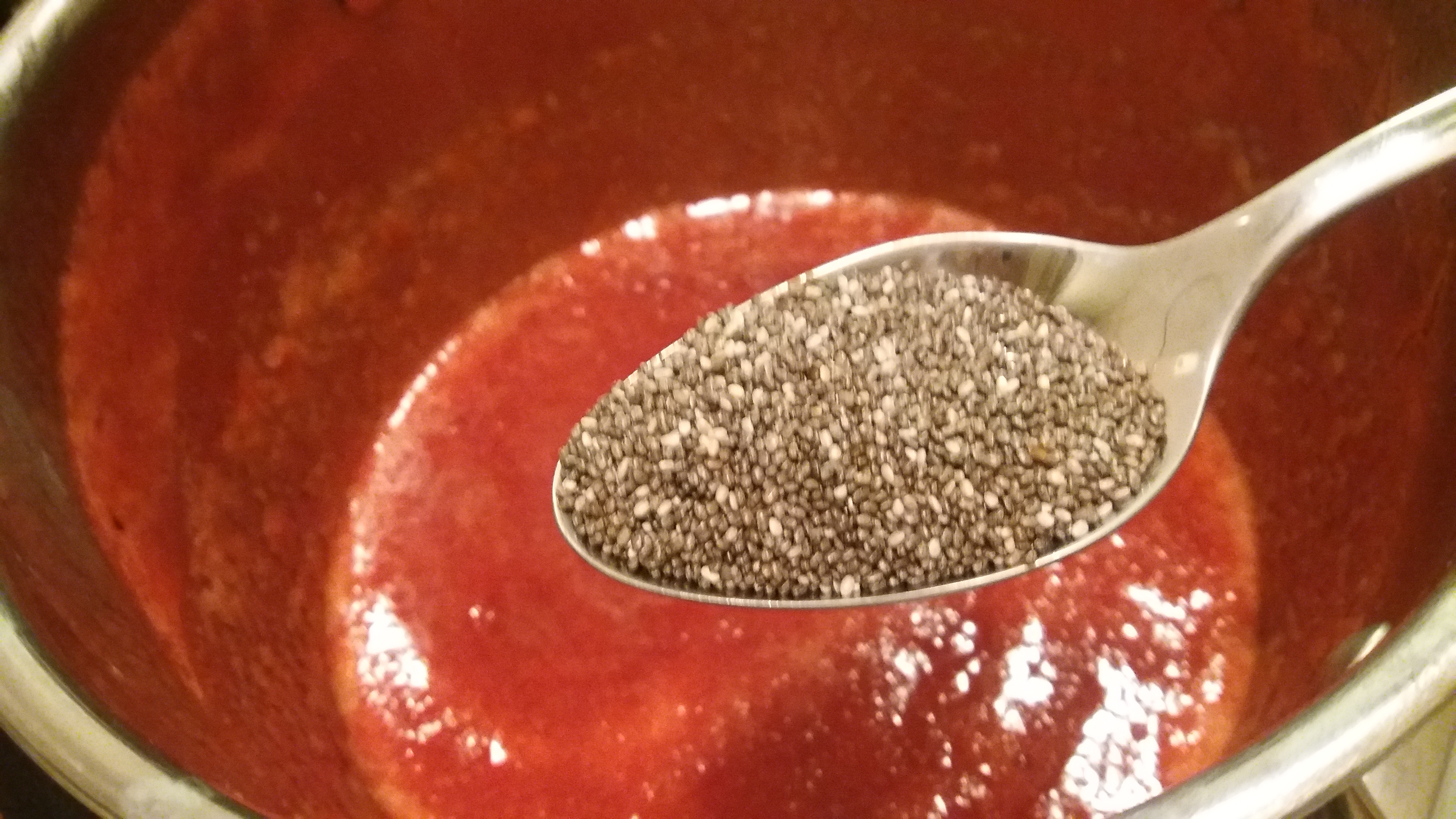 Para la mermelada no había encontrado sustituto saludable ¡hasta ahora! Vi varias recetas publicadas sobre ello y me decidí a intentarlo. ¡Cómo no se me había ocurrido antes! Pondremos algo de azúcar, pero sustituimos la elevadísima cantidad de ella que requieren las mermeladas tradicionales para tener su textura espesa, por semillas chia. Las semillas chia tienen unas propiedades nutricionales excepcionales, son consideradas un «superalimento», como os contaba en este otro post. No tienen sabor alguno, simplemente son nutritivas y, al ser capaces de retener hasta 10 veces su volumen en agua, dan la clave a la textura.