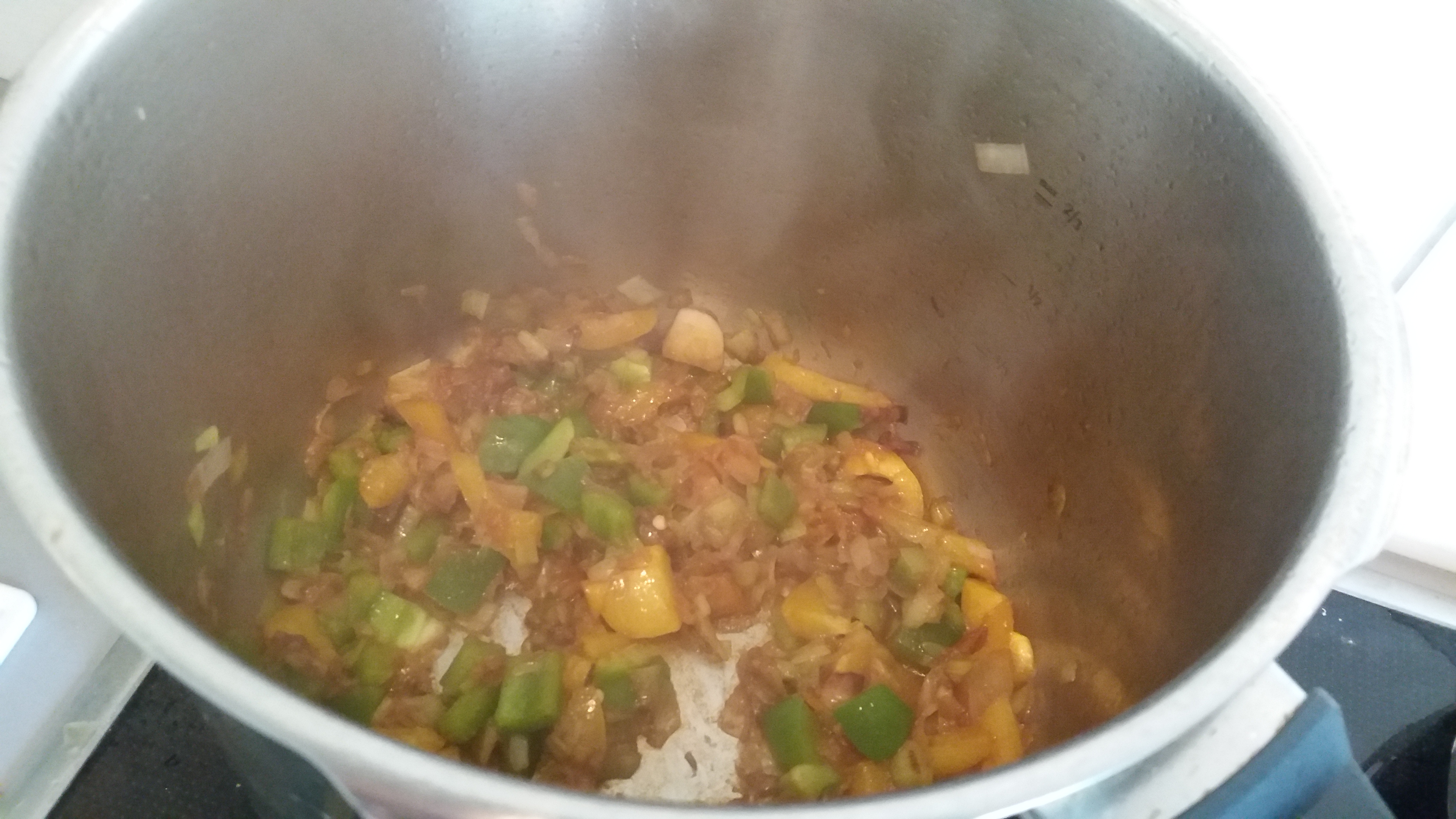 En esa misma cazuela ponemos un poco más de aceite y bajamos a fuego medio. Ponemos a pochar la cebolla/puerro y pimiento troceados pequeñitos durante 5 minutos.