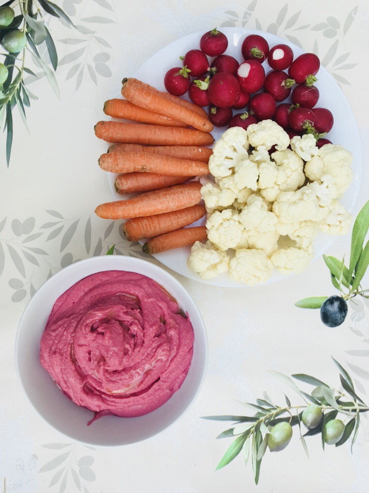 Cortamos mientras las crudités (zanahorias, pepino, cherrys, apio, rabanitos…) y colocamos en una fuente las verduras troceadas o los picos rodeando al bol del hummus.