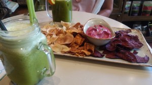 El hummus que tomamos me pareció espectacular. Sabe muy parecido a cualquier otro hummus, pero el hecho de que no tenga ajo y sí tenga remolacha le da un toque especial muy rico. Allí nos lo dieron con chips de verduras: si tenéis acceso a comprarlos o hacerlos, os lo recomiendo!