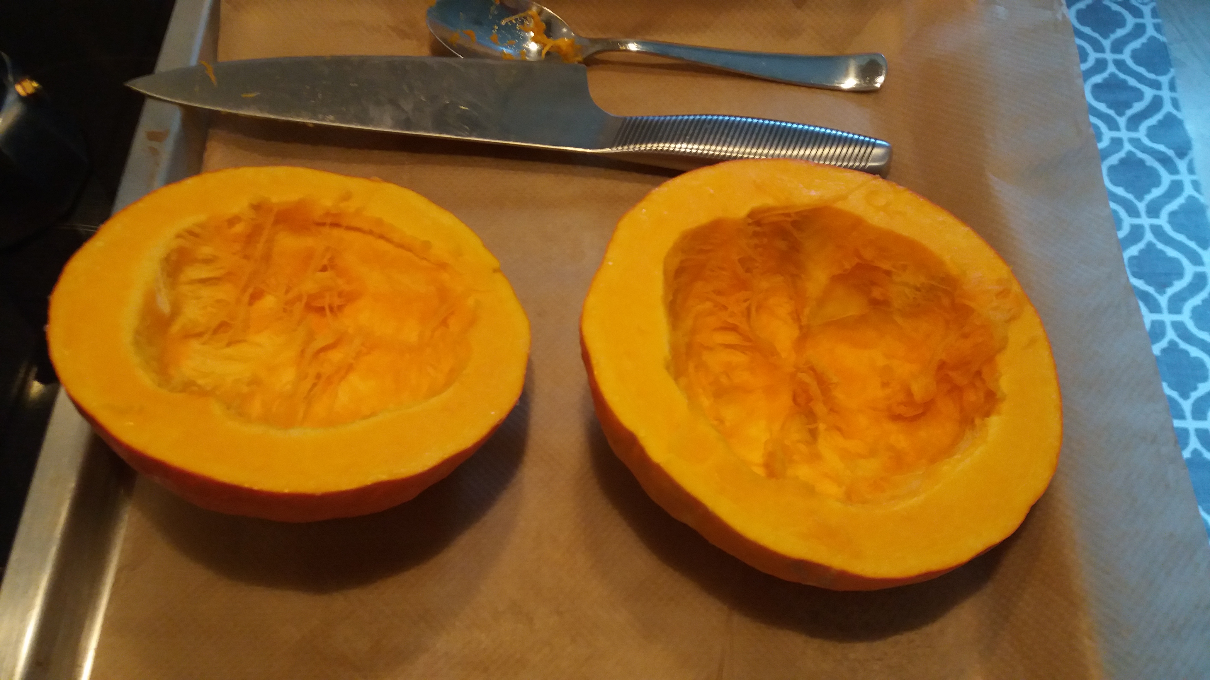 Cortamos la calabaza por la mitad y le quitamos las pepitas.