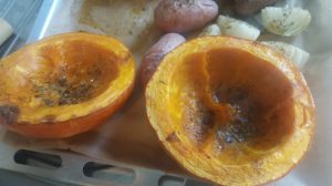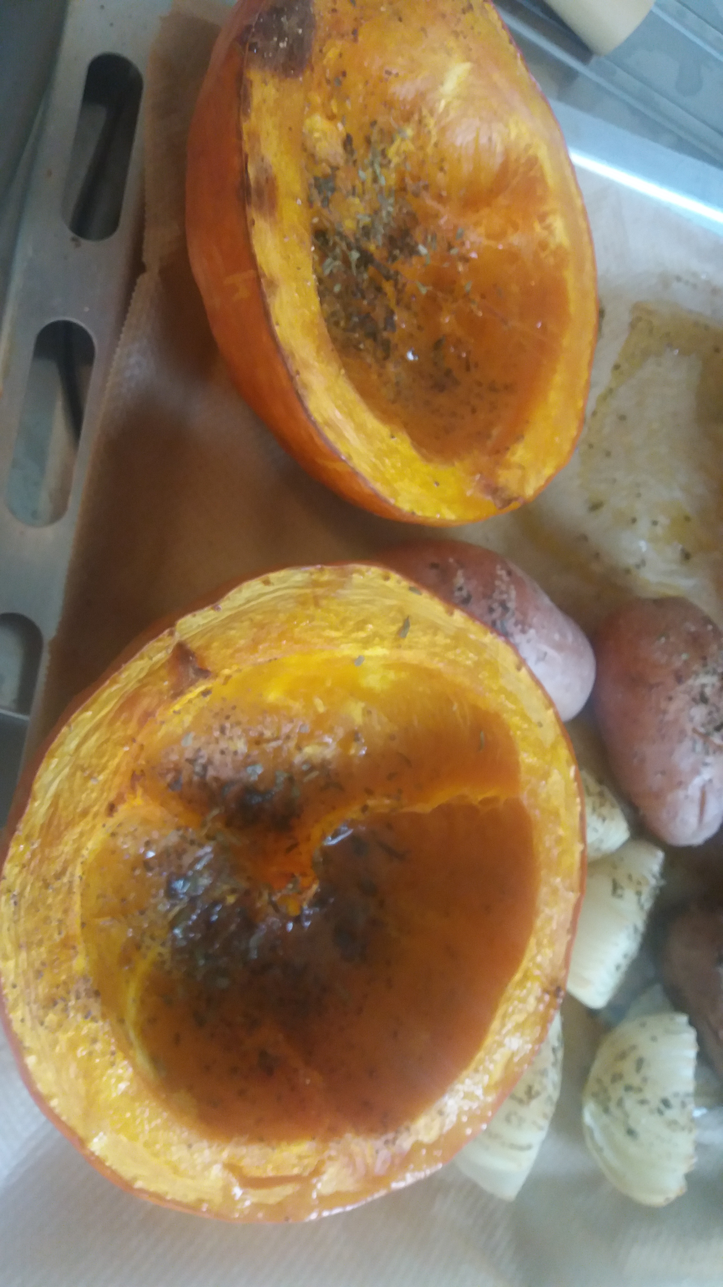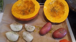 Colocamos todas estas verduras en una fuente apta para horno o directamente en la bandeja forrada con papel de horno (aproveché también para asar unos pimientos… ahí dejo la idea!). Ponemos un hilillo de aceite por encima y las especias (en caso de utilizarlas) y metemos todo en el horno hasta que las verduras estén tiernas, lo cual sera cuando la calabaza este blandita al pincharla con un tenedor. Aprox 30 minutos.