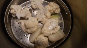 Cocemos la coliflor y la cebolla hasta que estén tiernas (yo lo hice en el cestillo de la olla express durante 5 minutos, podéis hacerlo con un estuche de vapor o bien en agua).
