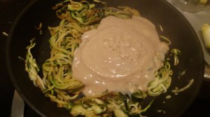 Cuando tengamos todo, incorporamos la salsa cremosa a la sartén de los calabacines y removemos un par de minutos.