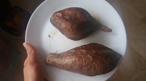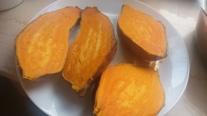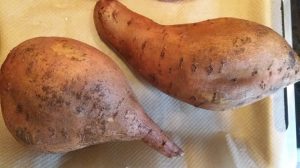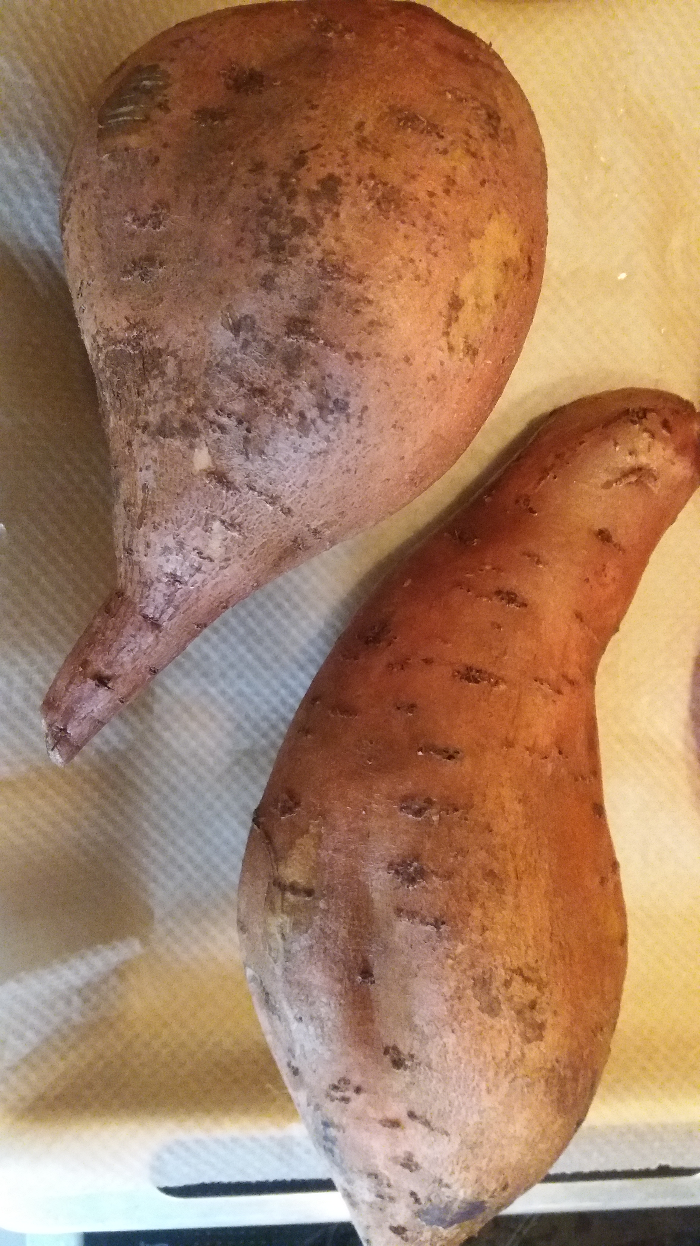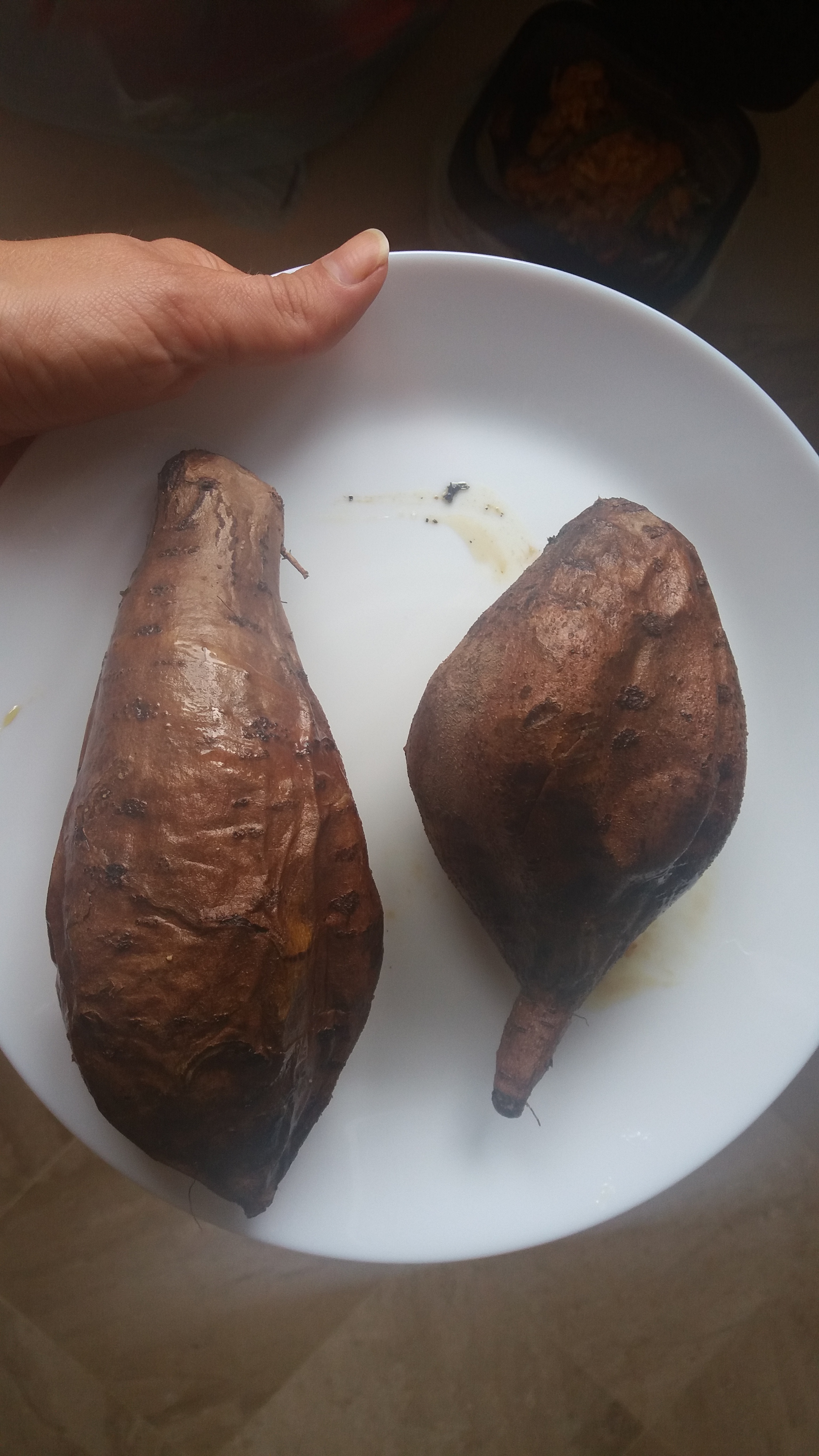 Limpiamos bien los boniatos (siempre tienen tierra!), los secamos y les hacemos unos cortes pequeños por varios sitios para que ayudar a que el calor entre bien. Los metemos en el horno (en una fuente o en una bandeja con papel de horno) y los dejamos hasta que estén bien tiernos, más o menos 40-60min.