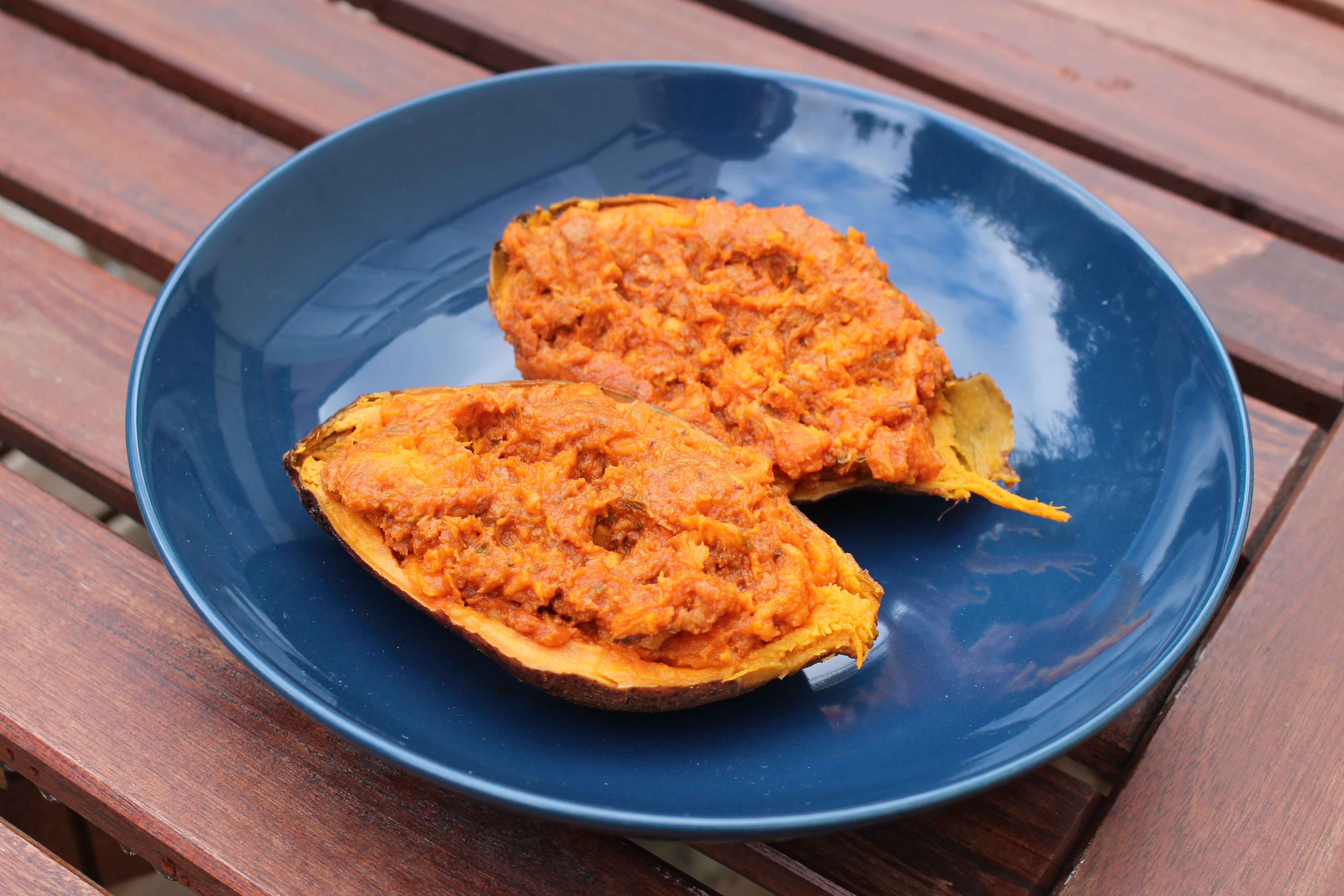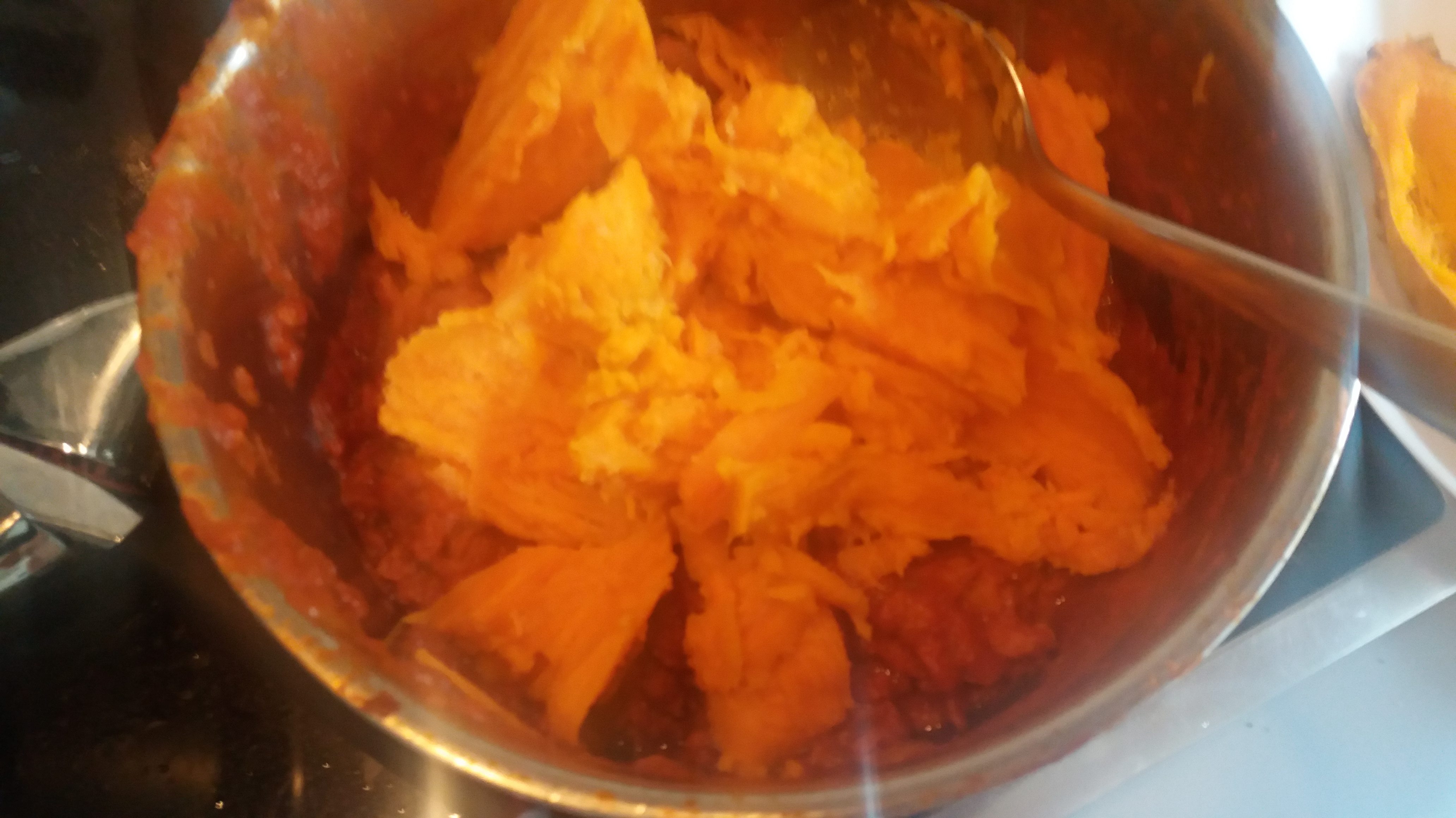 Mezclamos la pulpa del boniato que hemos sacado con la bolognesa, removiendo bien para que quede integrado, y vamos metiendo cucharadas de la salsa dentro del boniato, y por encima. OJO, puede que poner toda esa pulpa de boniato haga que nuestra bolognesa pierda cremosidad: id añadiendo poco a poco hasta tener la cremosidad que os guste, y el resto podréis utilizarlo con guarnición otro día, o incluso para repostería!