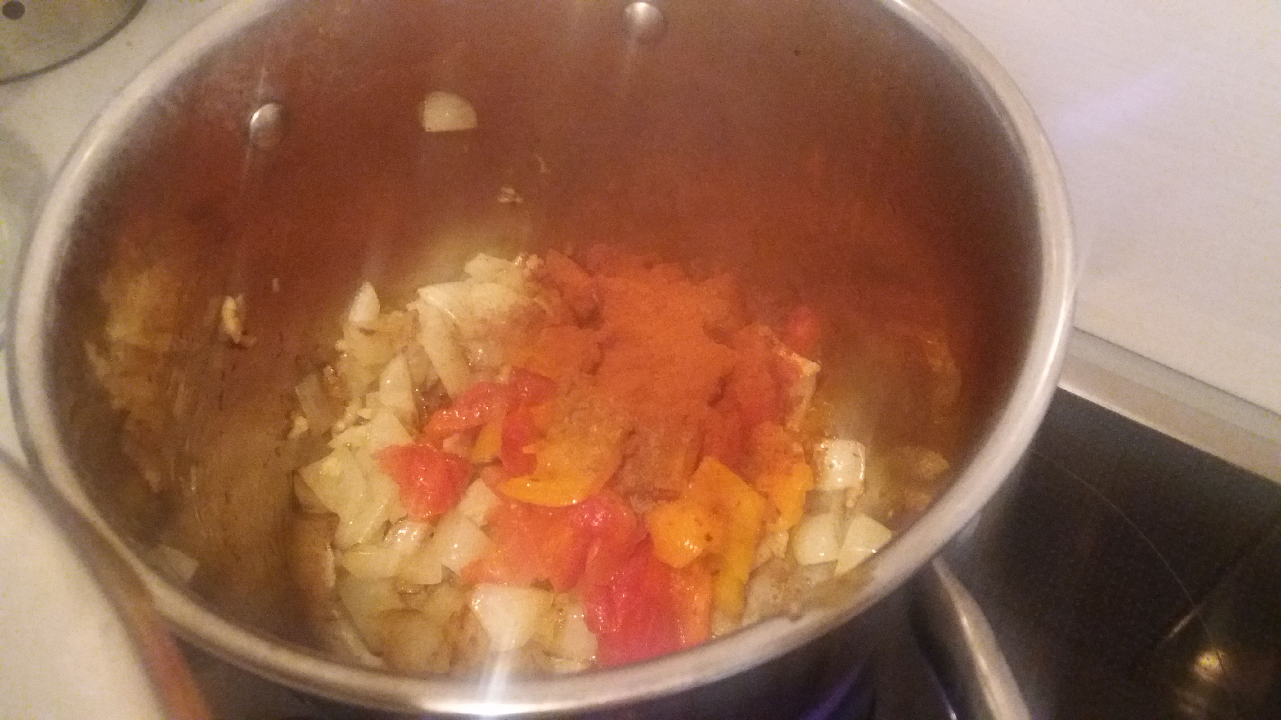 Mientras, lavamos y cortamos en cuadraditos de 1 cm el tomate y el pimiento. Pasado el tiempo de la cebolla, incorporamos el tomate, pimiento, comino, pimentón y sal, y removemos. Lo dejamos 7 minutos tapado.