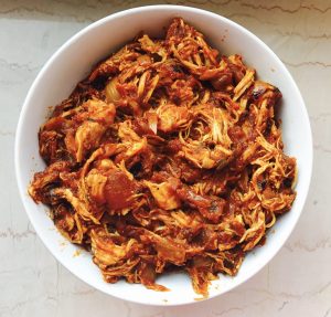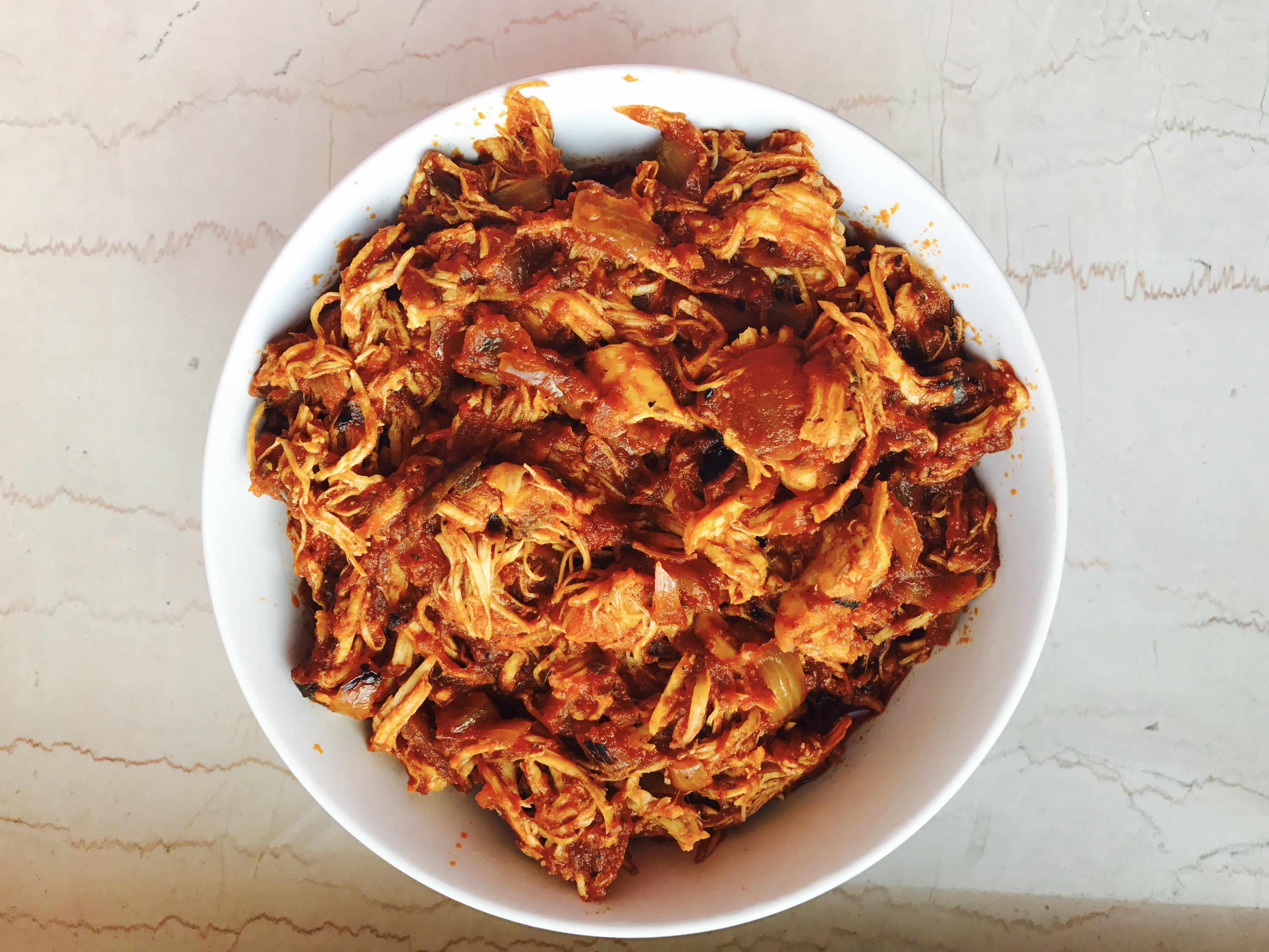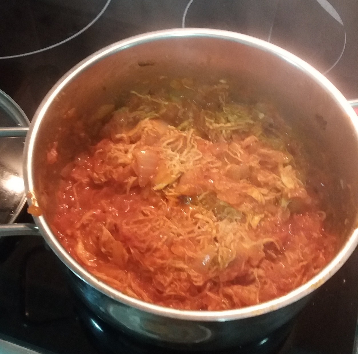 Añadimos el tomate frito y un chorrito de agua (o del caldo de cocer las pechugas, si ya han terminado), la pizca de sal y las especias. Cuando tengamos las pechugas deshilachadas, las añadimos también a la sartén o cazuela, y dejamos todo junto integrándose a fuego suave durante 5 minutos tapado.